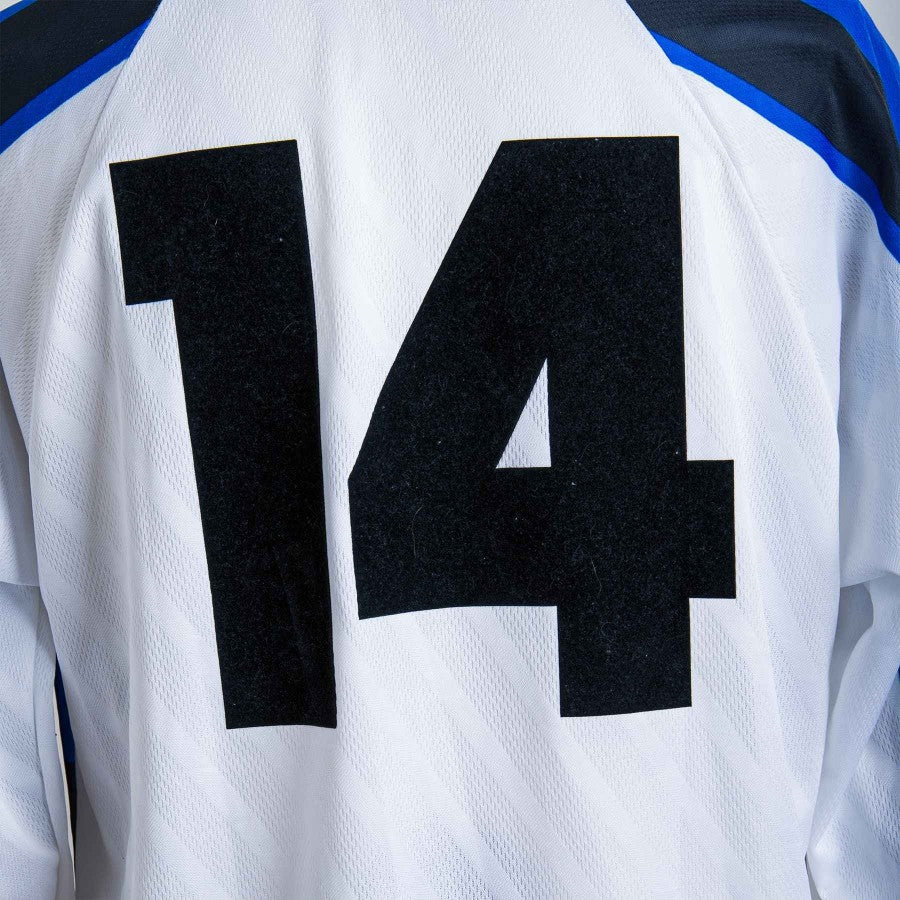 Maglia Inter stagione 1996/1997 modello Away a maniche lunghe di colore bianco con inserti blu e neri. Sul fronte è applicato in flock lo sponsor Pirelli, mentre sul petto sono ricamati il logo squadra ed il logo Pirelli. In basso è ricamata in piccolo la lettering INTER mentre sul retro è floccato in nero il numero 14.
