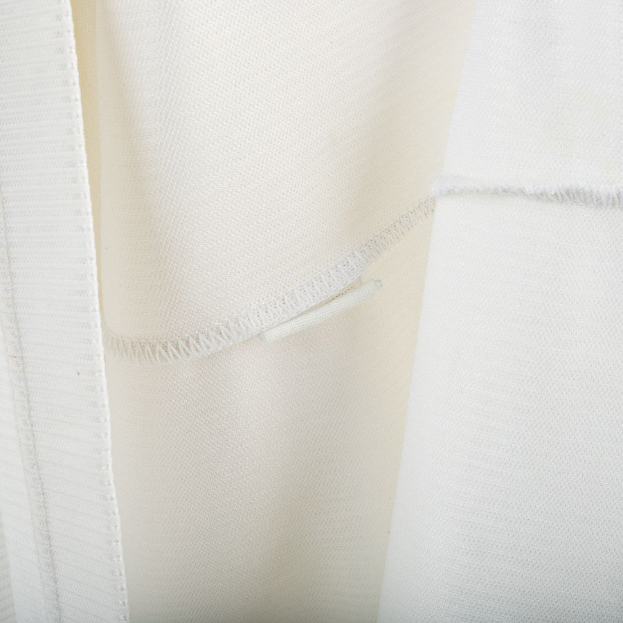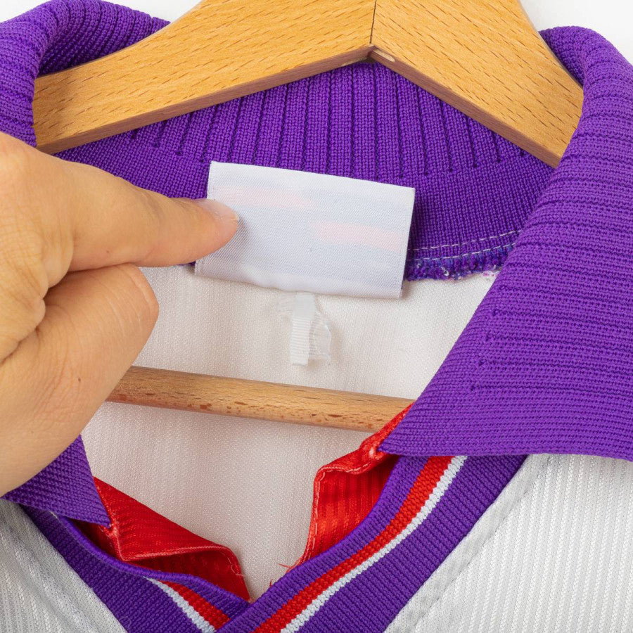 Maglia away della Fiorentina stagione 1995/1996 prodotta da Reebok. Classica versione bianca con inserti viola e rossi. Colletto a polo viola con bordo rosso e chiusura a triangolo. Logo Reebok ricamato sul petto destro e stemma ACF Fiorentina cucito lato cuore. Sponsor centrale “Sammontana Gelati all'Italiana” stampato in blu. Iconici gigli viola stampati sulle maniche. Patch Reebok “A.C. Fiorentina” cucita sul fondo frontale, tipica delle versioni ufficiali. Etichetta Taglia non visibile ( corrispomde ad una M/L)