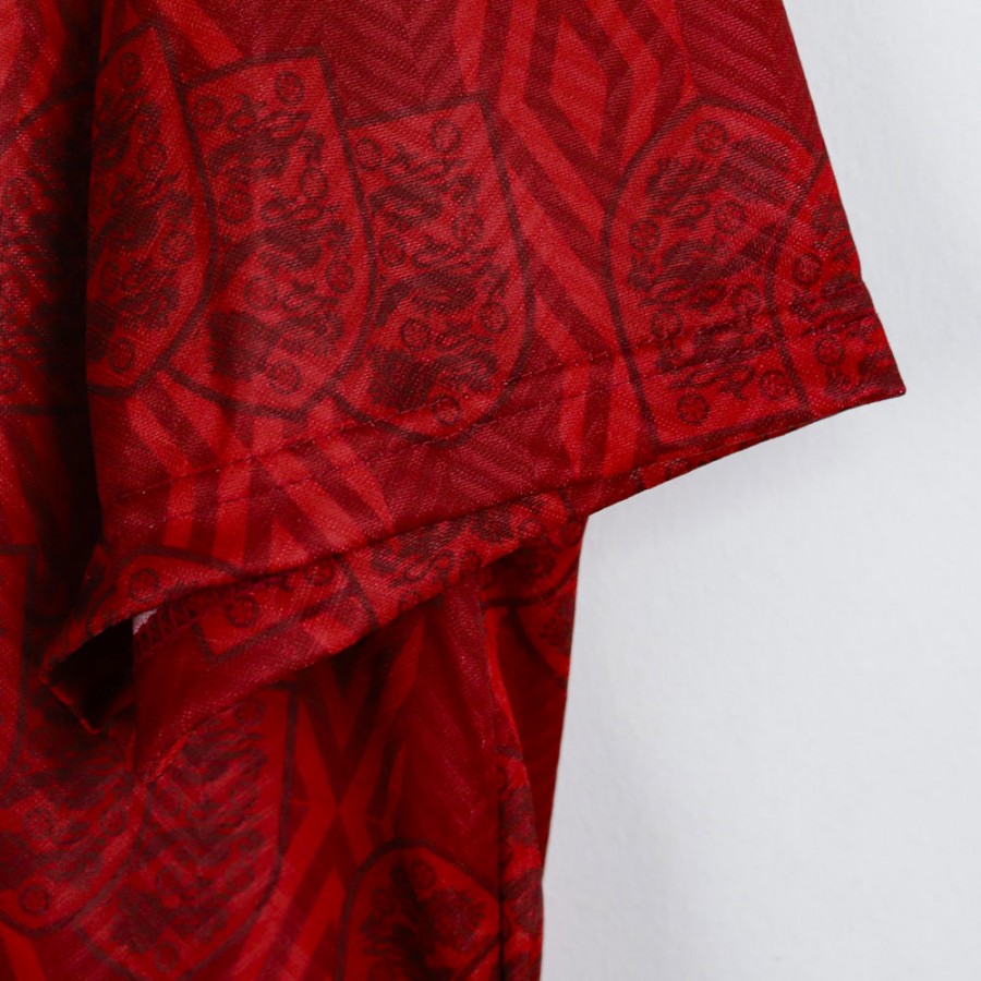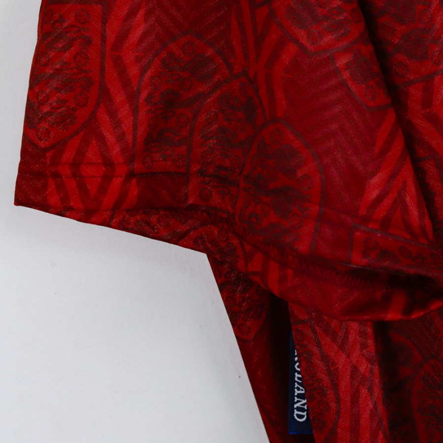 Questa è la maglia Away ufficiale della nazionale inglese per la stagione 1993/1994, prodotta dallo sponsor tecnico Umbro. Di un intenso colore rosso, questa maglia è caratterizzata da un intricato motivo geometrico tono su tono, che aggiunge profondità e dinamismo al design. Il colletto è blu navy con dettagli bianchi, in contrasto con il corpo rosso della maglia. Lo stemma della nazionale inglese, con i tre leoni, è posizionato sul lato cuore, mentre il logo Umbro è ricamato in bianco sul lato destro del petto. Questa versione della maglia, che non presenta sponsor commerciale, è un esempio perfetto dello stile classico e sobrio dell'epoca.
