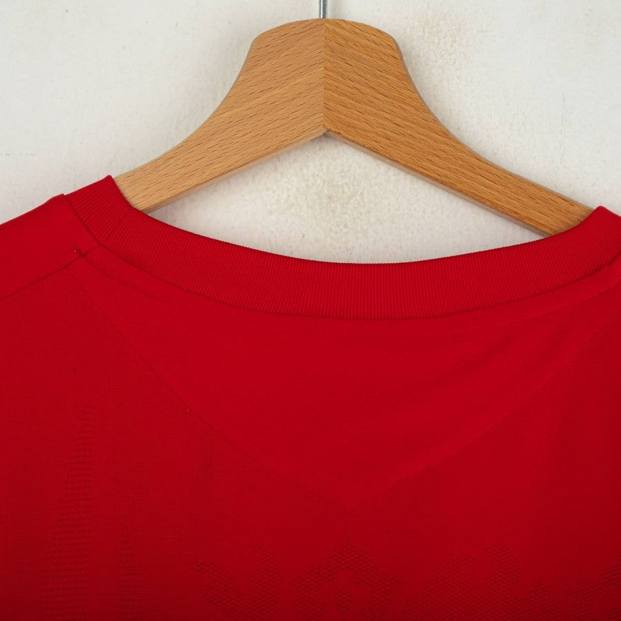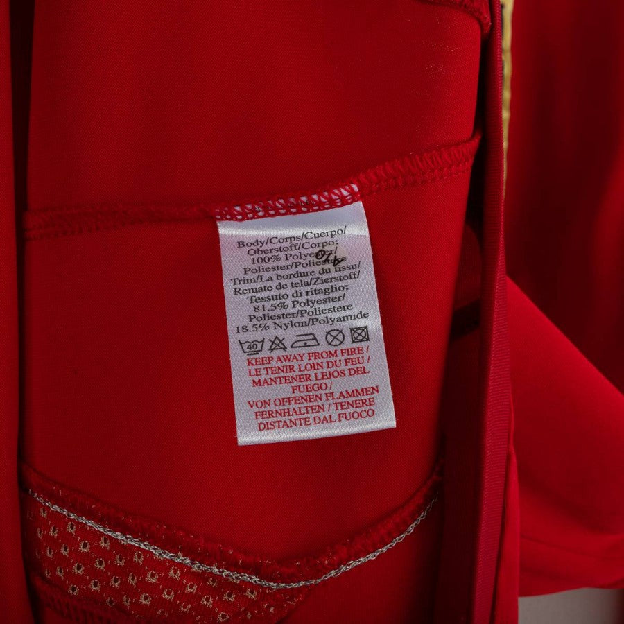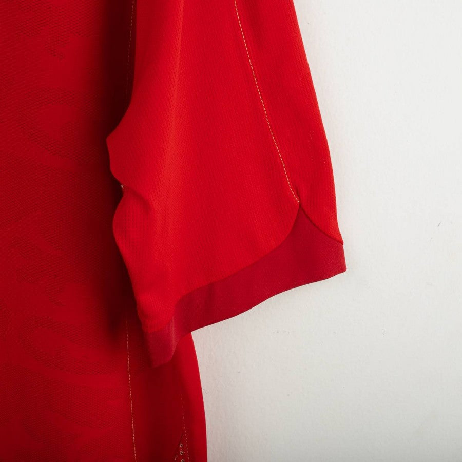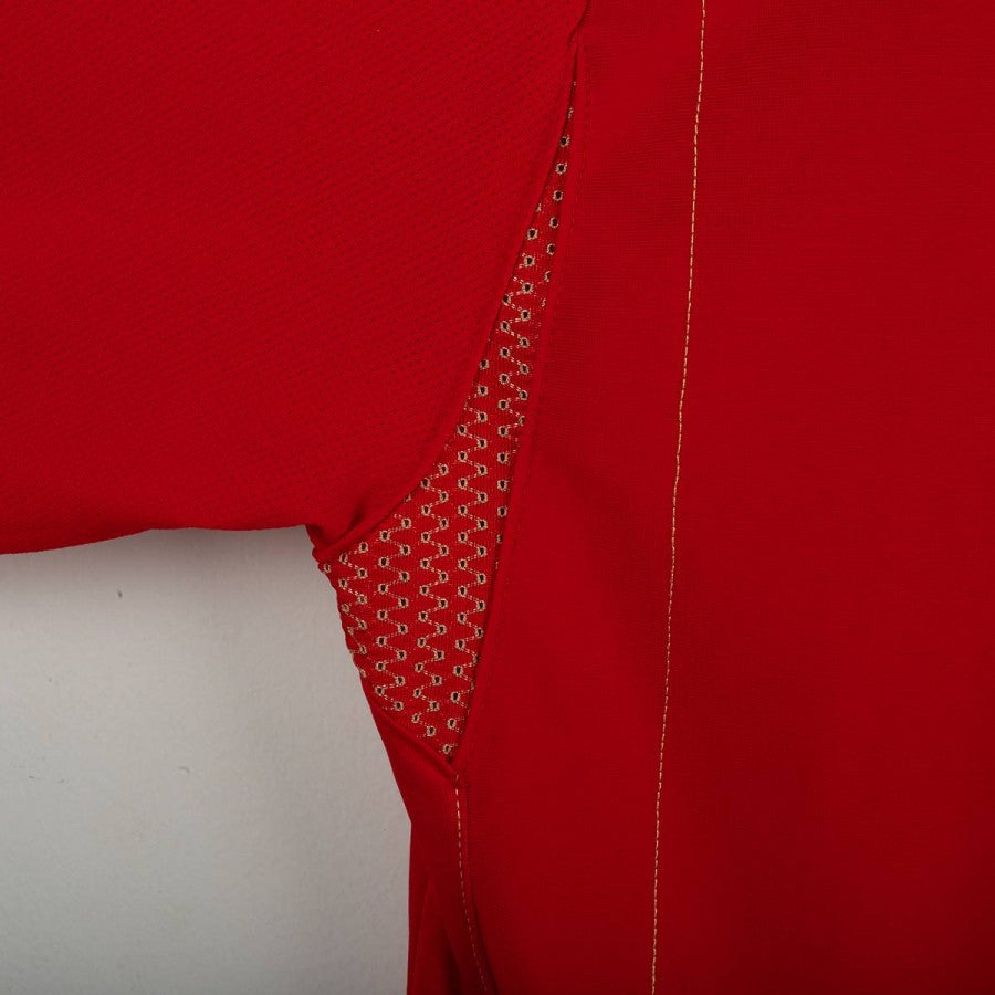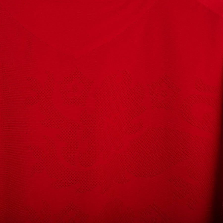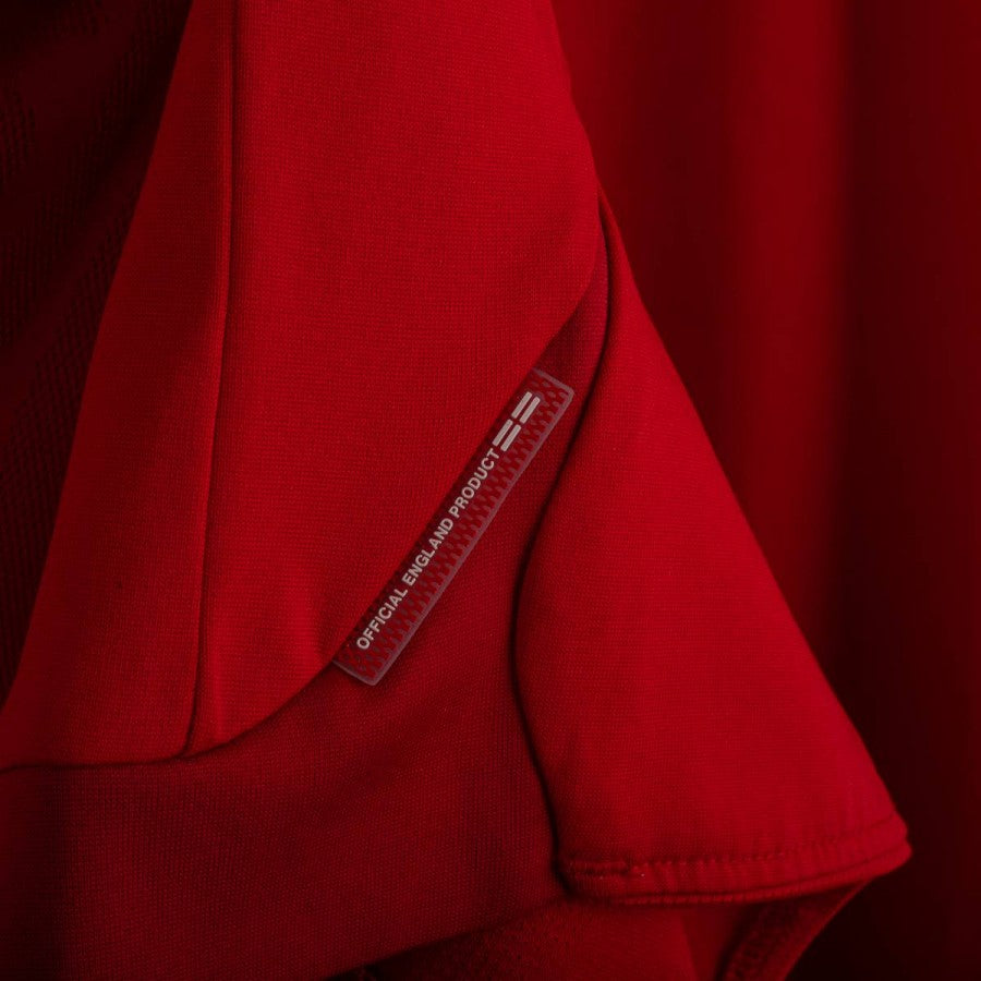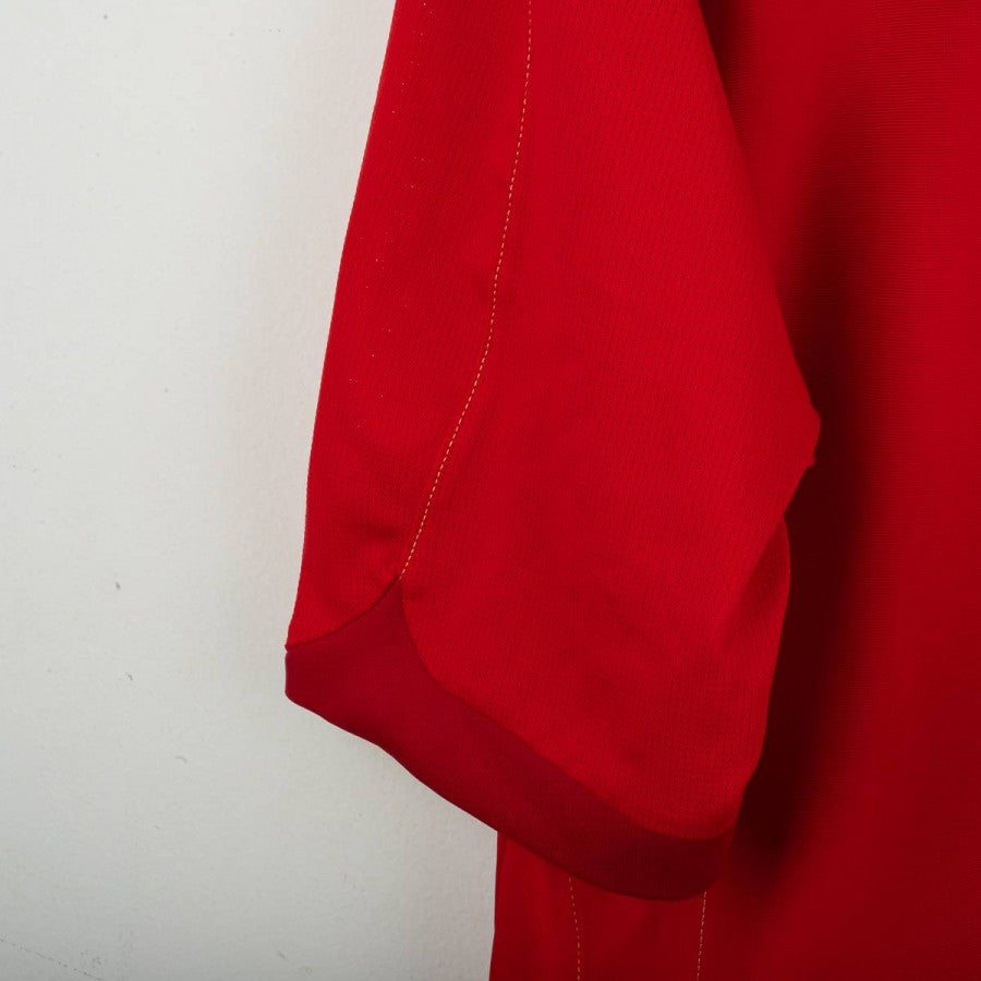 Maglia away della Nazionale Inglese utilizzata nella stagione 2006, prodotta da Umbro. Colore rosso con dettagli bianchi e dorati. Logo Umbro ricamato in oro sul petto destro, stemma Three Lions cucito lato cuore con stella dorata a ricordo del Mondiale 1966. Dettagli traforati sulle spalle e trama tono su tono con i Tre Leoni sul retro. Realizzata in tessuto tecnico traspirante per garantire comfort e leggerezza. Taglia XL.