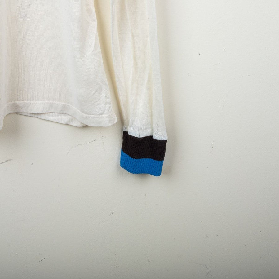 Maglia away a maniche lunghe dell'FC Internazionale utilizzata nella stagione 1987/1988, prodotta da Le Coq Sportif. Colore bianco con colletto e polsini in maglia a costine neri e blu. Logo Le Coq Sportif ricamato in blu sul petto destro, stemma Inter cucito lato cuore con stella dorata sovrastante. Sponsor Misura in vellutino grigio con dettagli rossi applicato sul fronte.