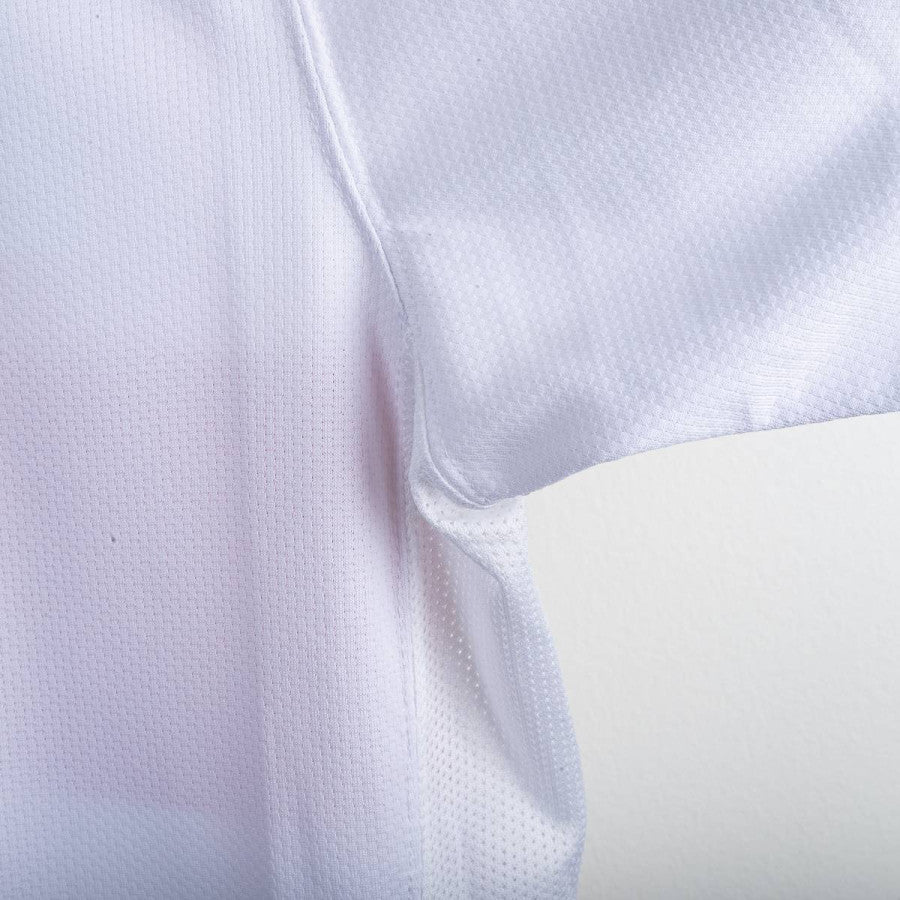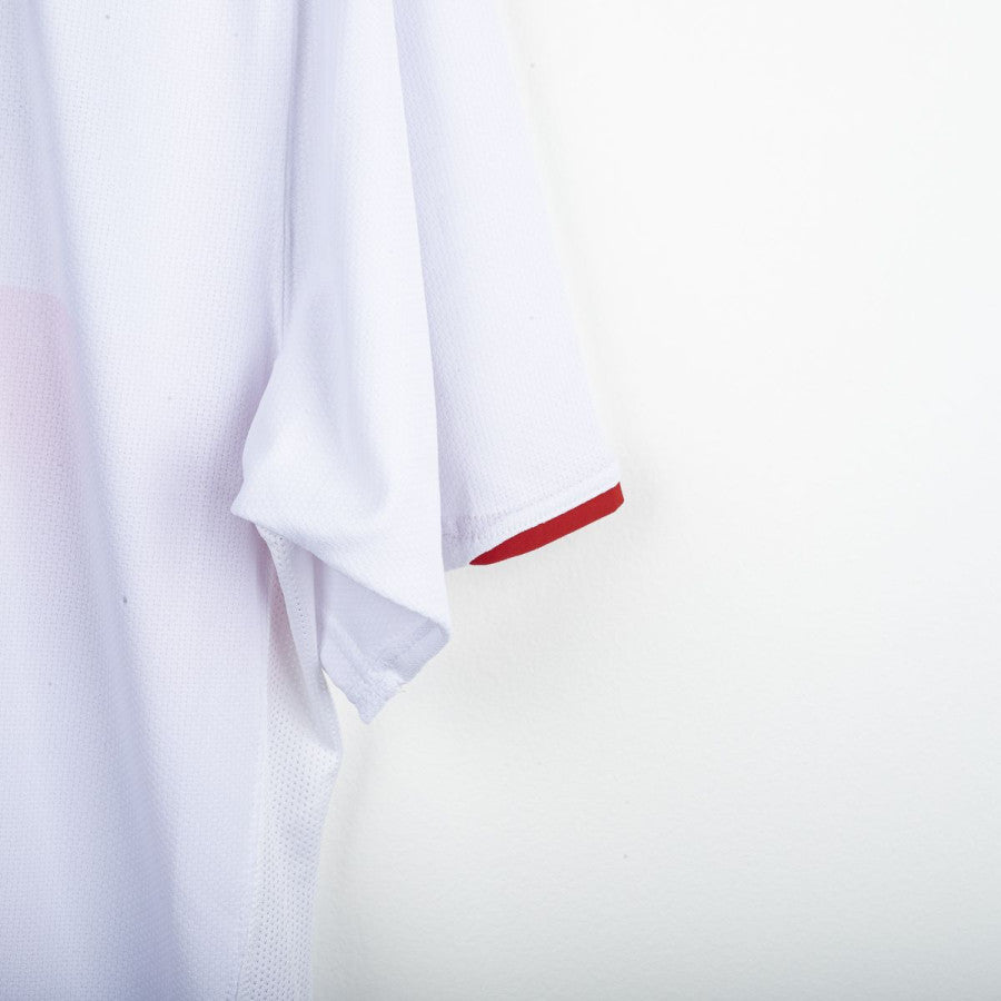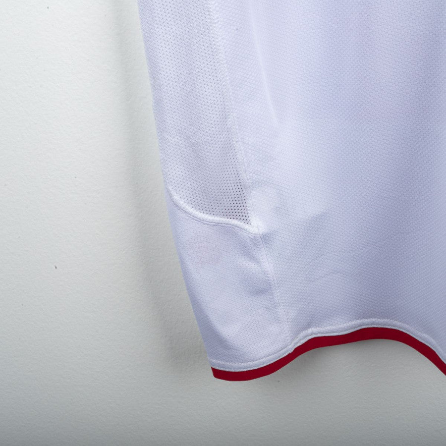 Maglia away dell'Inter indossata nella stagione 2008/2009, prodotta da Nike. Design bianco con grande croce rossa sul petto, dedicata al centenario del club (1908-2008). Stemma Inter cucito lato cuore con bordatura dorata e scritta “100 Anni Inter”, logo Nike ricamato lato destro. Scudetto tricolore applicato al centro del petto. Sponsor Pirelli stampato in nero. Sul retro nome Adriano e numero 10 in stampa azzurra. Dettaglio “Centenario Inter” ricamato all'interno del colletto e stemma celebrativo 1908-2008 sotto al collo posteriore. Colletto a V. Vestibilità regolare. Taglia L.