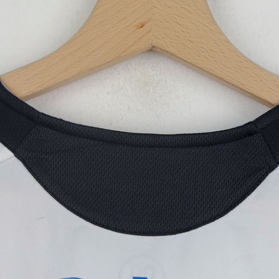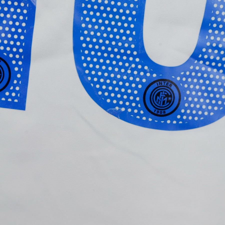 Maglia away ufficiale dell'Inter, stagione 2004/2005, personalizzata con il nome di Adriano e il numero 10. Realizzata dallo sponsor tecnico Nike, la maglia è di colore bianco con colletto nero e banda centrale orizzontale blu e nera, con al centro lo sponsor commerciale Pirelli. Lo stemma dell'Inter è applicato sul petto con la stella, mentre sulla manica destra è cucita la patch ufficiale della Serie A. Sul retro è presente la personalizzazione Adriano 10 in caratteri blu con dettagli traforati. Taglia: L.