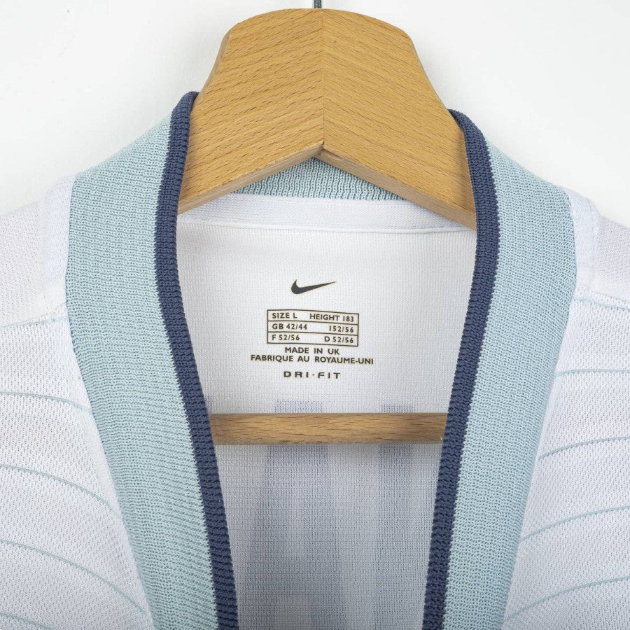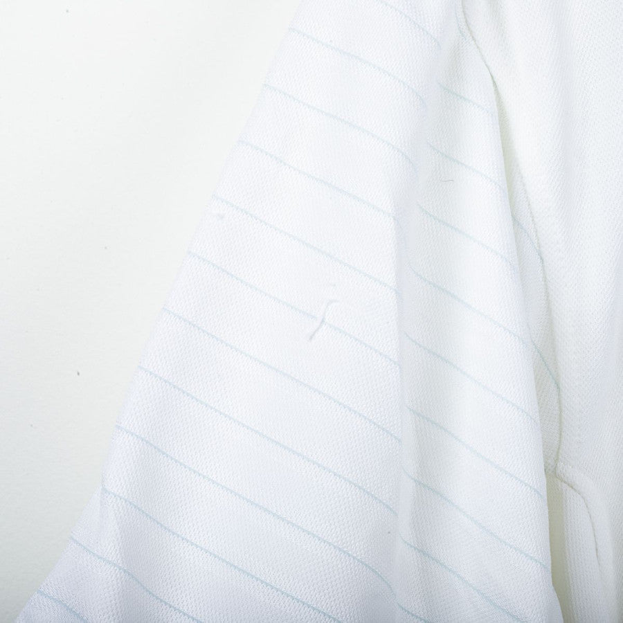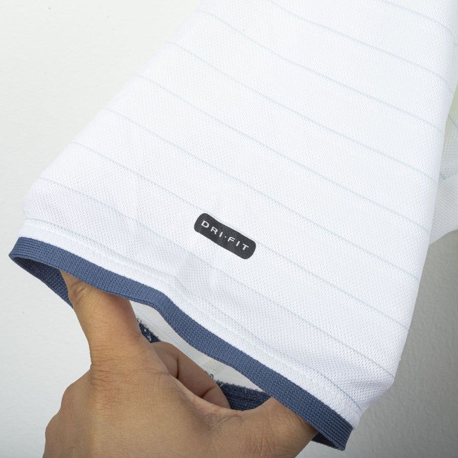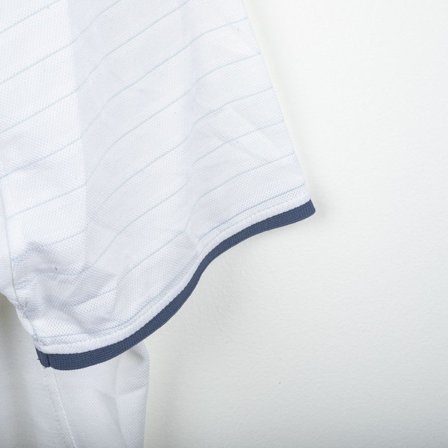 Maglia away dell'Inter utilizzata nella stagione 2000/2001, prodotta da Nike. Modello bianco con sottili righe orizzontali azzurre e colletto a V con bordi blu. Stemma Inter cucito lato cuore con stella gialla sovrastante e swoosh Nike ricamato lato destro. Sponsor Pirelli applicato in flock nero al centro. Nome Ronaldo e numero 9 applicati in nero sul retro. Vestibilità regolare. Taglia L.