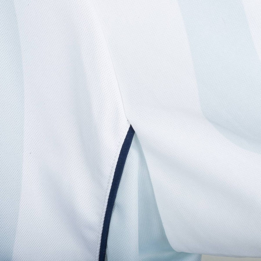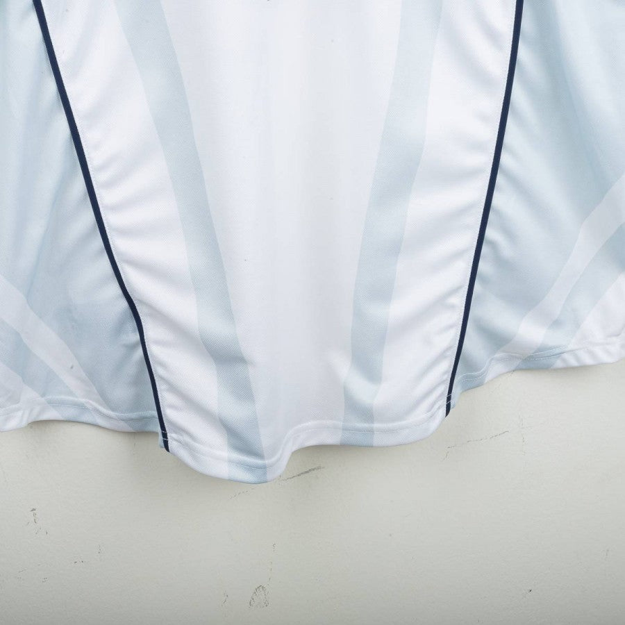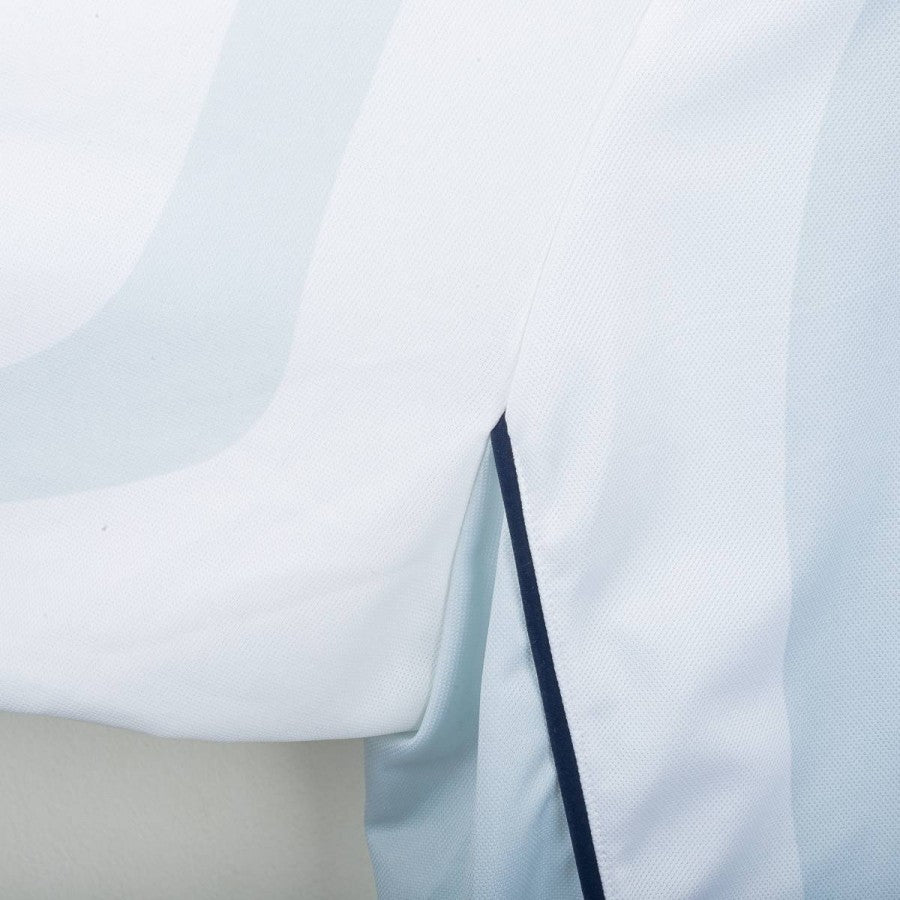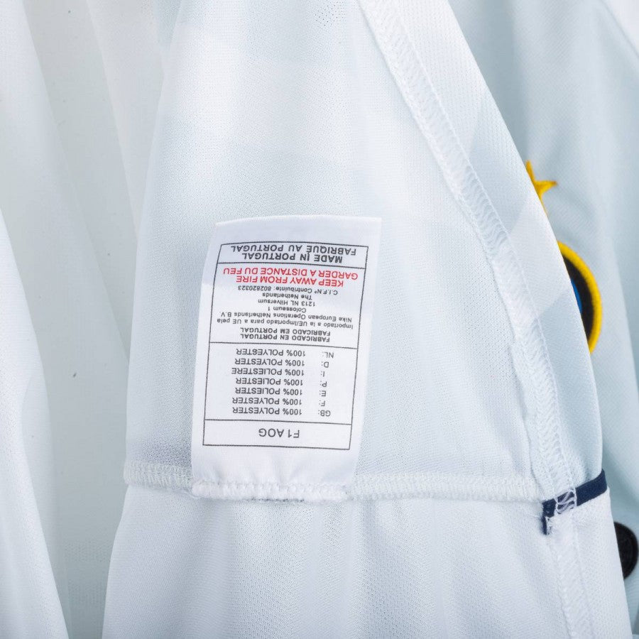 Maglia away Inter della stagione 2001/2002 realizzata da Nike. Colore bianco con sfumature azzurre sul fronte e sul retro. Sponsor centrale "Pirelli" applicato in vellutino nero. Logo Nike ricamato sul petto destro, stemma Inter cucito lato cuore con stella gialla ricamata. Nome "RONALDO" e numero 9 applicati sul retro in nero. Girocollo con profili blu navy. Taglia XL. Prodotto ufficiale Nike, fornitore tecnico Inter.