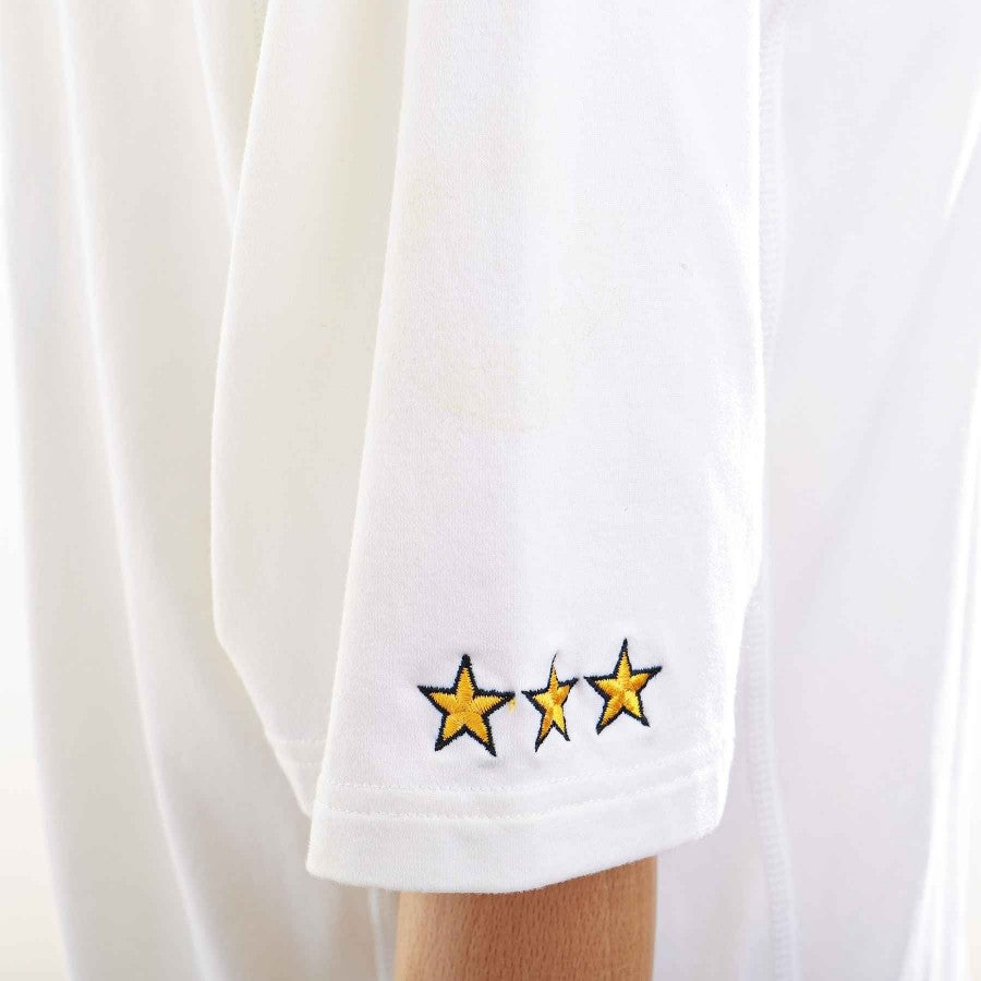 Maglia da gara dell'Italia a maniche corte di colore bianco utilizzata per le Qualificazioni per Euro 2000. Numero 5 applicato in piccolo sul petto e in grande sul retro. Logo Italia cucito lato cuore, loghi Kappa ricamati sulle maniche, Tre stelline Mondiali ricamate sulla manica destra.
