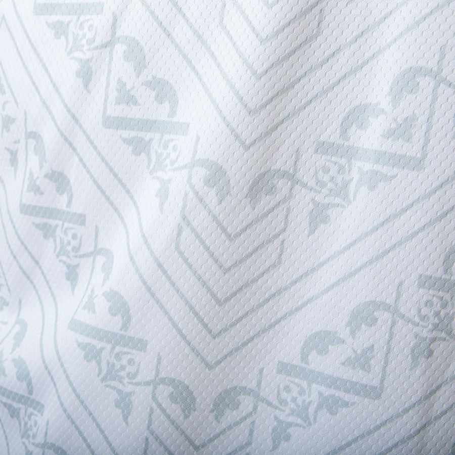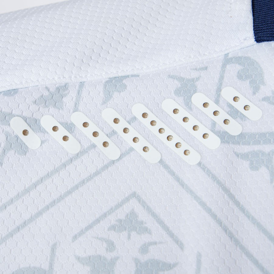 Modello away a mezza manica e a girocollo. Di colore bianco con dettagli blu, la maglia porta applicata lato cuore la patch in gommina dell'Italia con le 4 stelle.