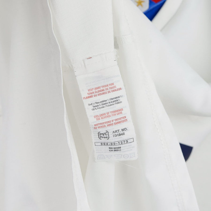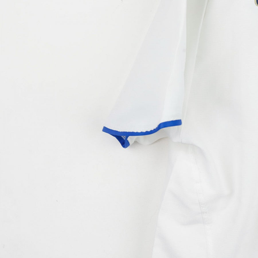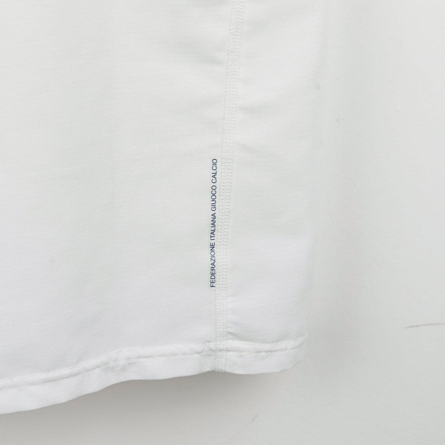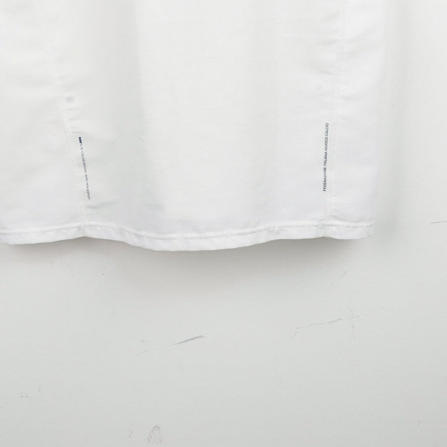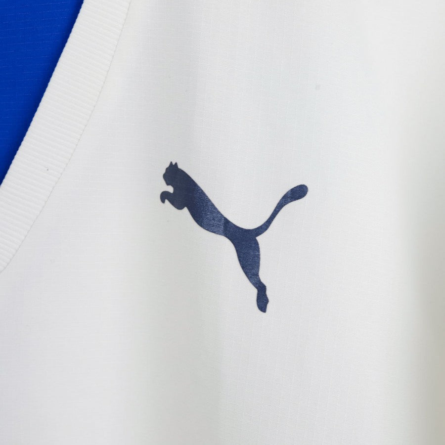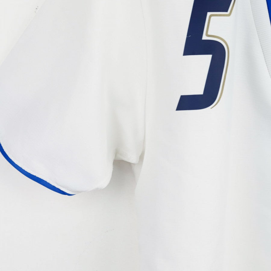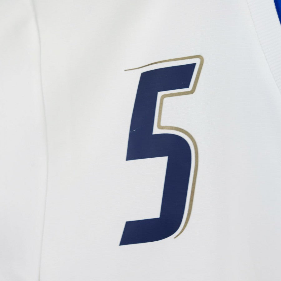 Maglia away della Nazionale Italiana di calcio indossata durante il memorabile Mondiale del 2006, anno della vittoria del quarto titolo iridato. Prodotta dallo sponsor tecnico Puma, presenta un design elegante con base bianca, dettagli blu e collo a V con inserto tricolore interno. Sul petto sono presenti lo stemma FIGC con le tre stelle, il logo Puma e il numero 5, mentre sul retro compaiono nome e numero di Fabio Cannavaro, capitano e simbolo di quella squadra leggendaria. La taglia è M. Un cimelio di grande valore legato alla storica cavalcata azzurra in Germania.