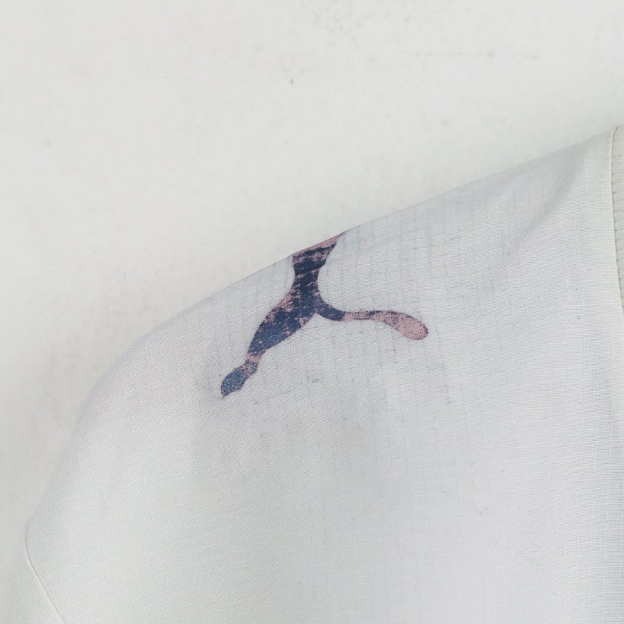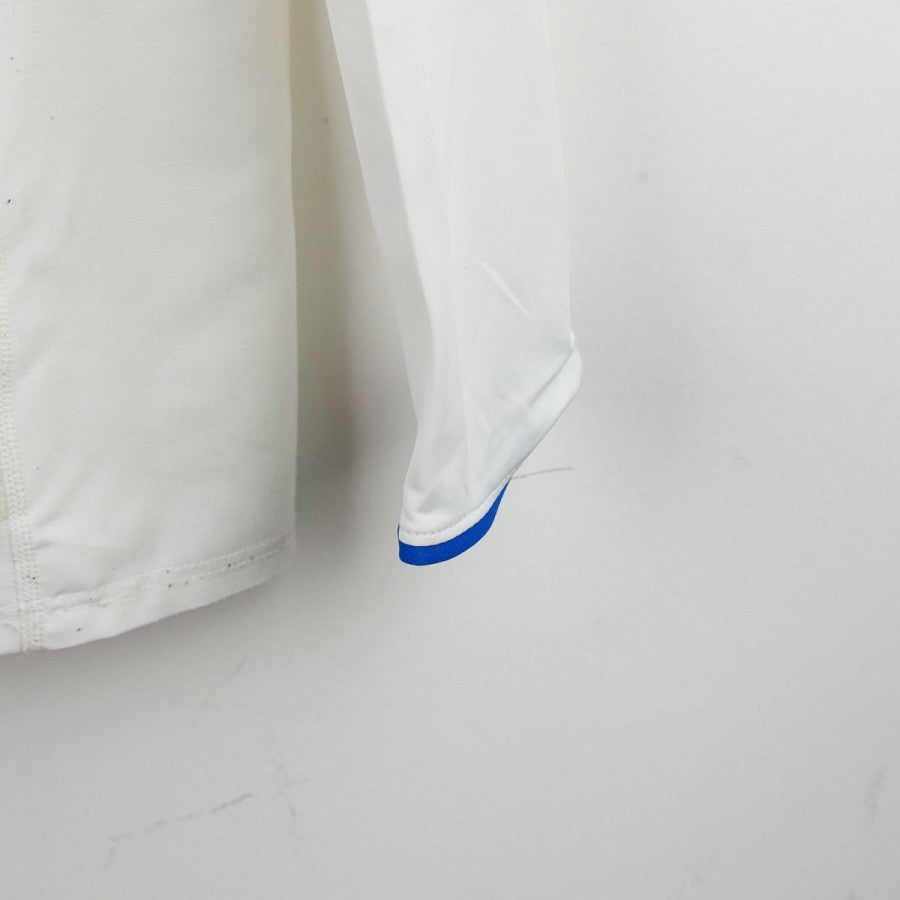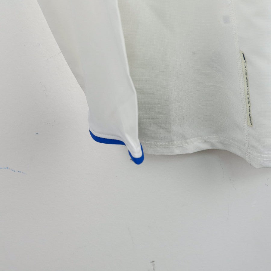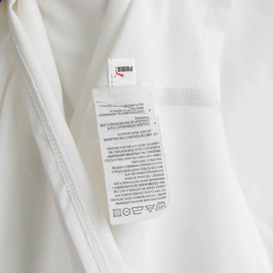 Maglia ufficiale away della Nazionale Italiana per la stagione 2006, prodotta da Puma e personalizzata con il nome Del Piero, numero 7. La maglia è a maniche lunghe, di colore bianco con colletto a V e dettagli blu sul bordo delle maniche. Il logo Puma è posizionato sul petto a destra, mentre lo stemma della FIGC si trova al centro sotto il colletto. Il numero 7 è visibile sul lato sinistro del petto. Sul retro sono presenti il nome "del piero" e il numero 7 in blu con contorno dorato. La maglia è disponibile nella taglia M.