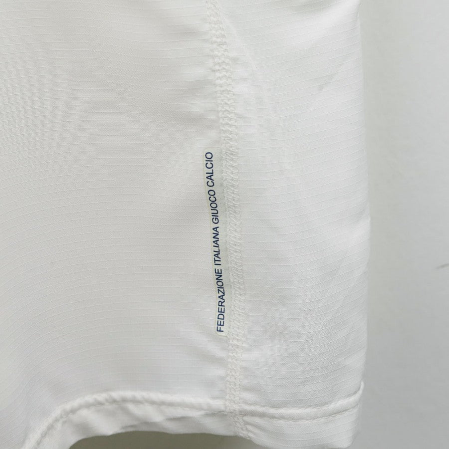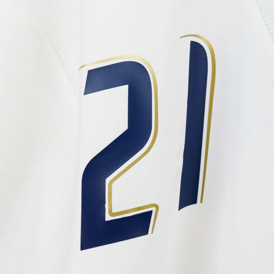 Maglia away dell'Italia prodotta da Puma per la stagione 2006, taglia XL. Il design è essenziale e pulito, dominato dal bianco con dettagli blu su colletto e maniche, arricchito dallo stemma della FIGC a centro petto con le tre stelle a simboleggiare i titoli mondiali conquistati fino ad allora. Sul retro, la maglia presenta il numero 21 e il nome Pirlo.