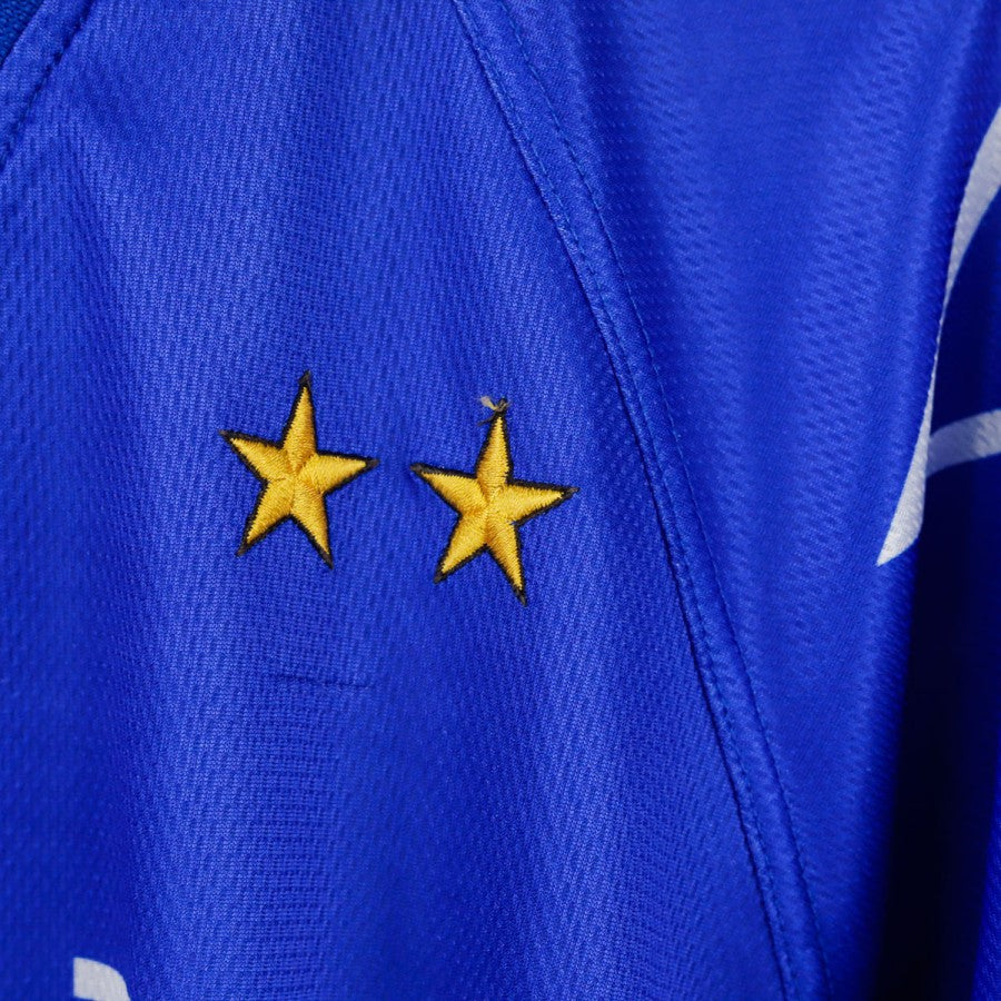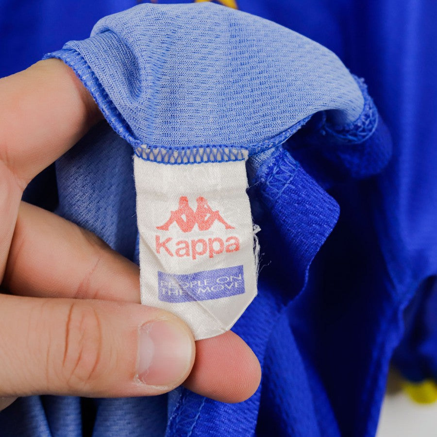 Maglia away della Juventus per la stagione 1995/1996, realizzata da Kappa. Il colore blu con dettagli gialli è uno dei design più iconici della Vecchia Signora, utilizzato in particolare nelle competizioni europee. Sul petto troviamo il logo Kappa e lo stemma della Juventus con le due stelle, simbolo dei titoli nazionali vinti. Lo sponsor Sony campeggia al centro della maglia.