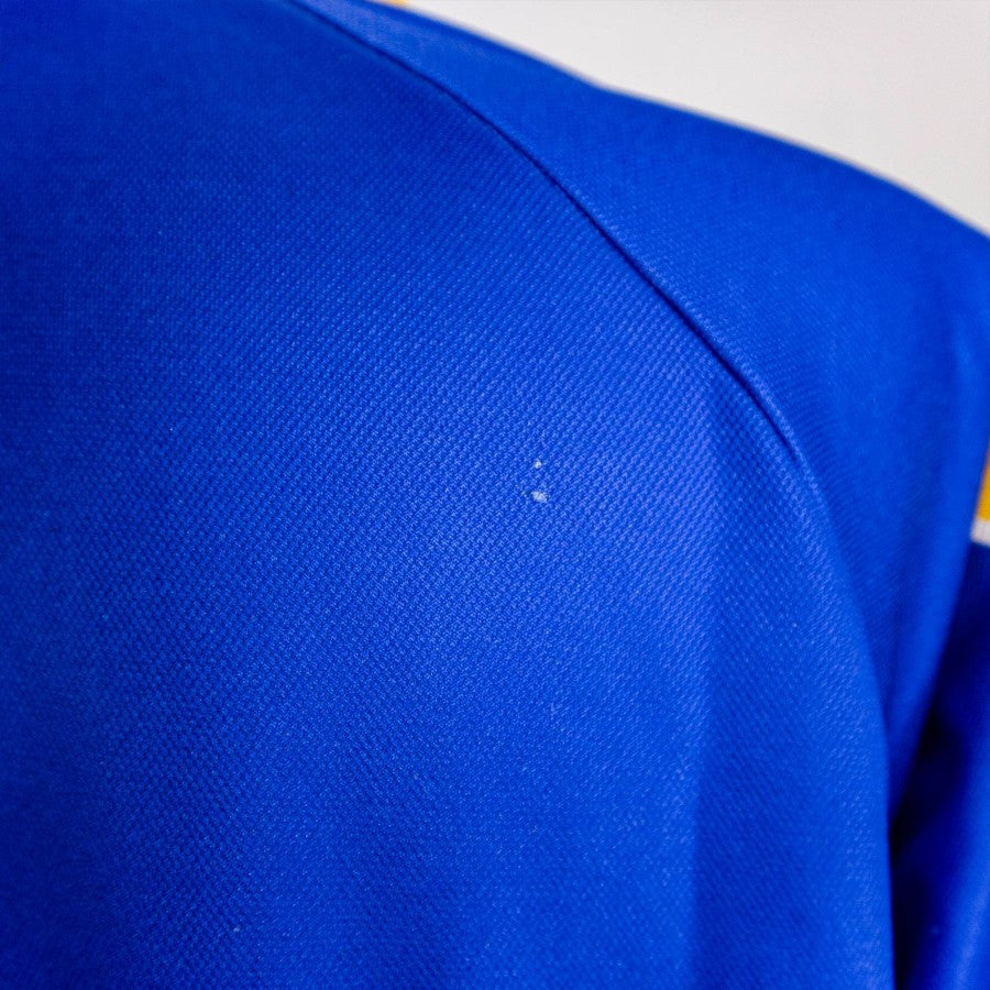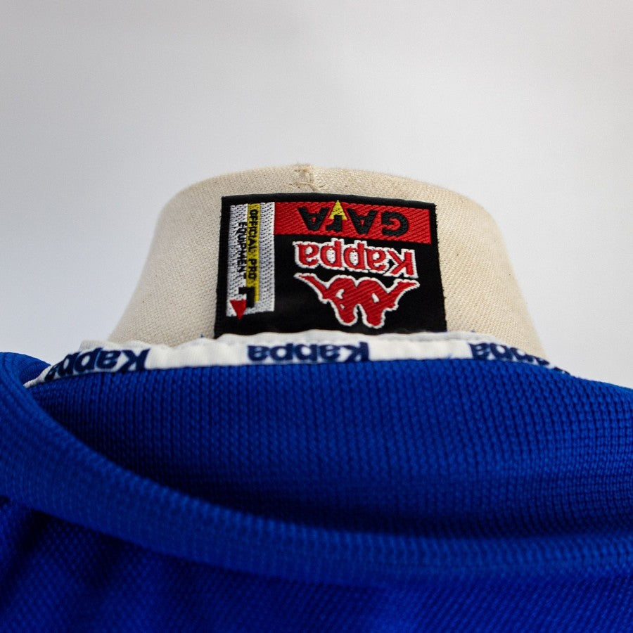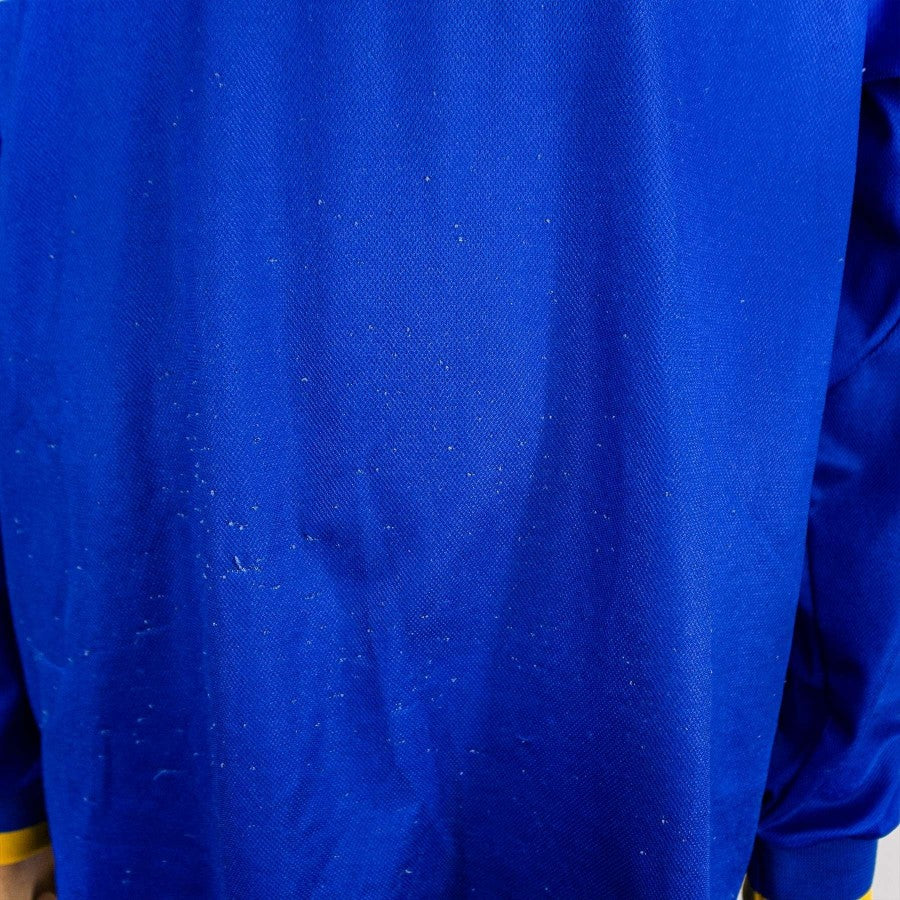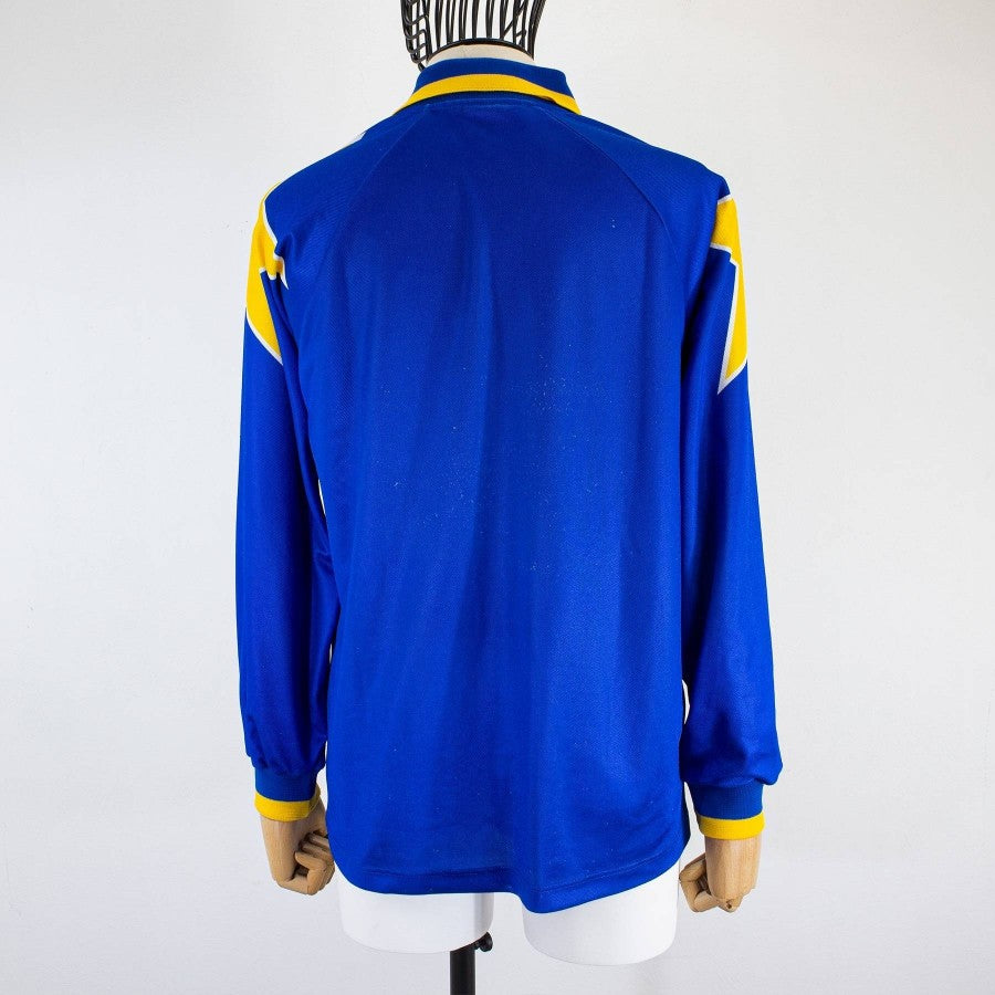 Maglia away di colore blu con inserti gialli della Juventus della stagione 1995/1996. Logo Kappa cucito. Scudetto e Coppa Italia cuciti. Sponsor Sony stampato nella trama della maglia.