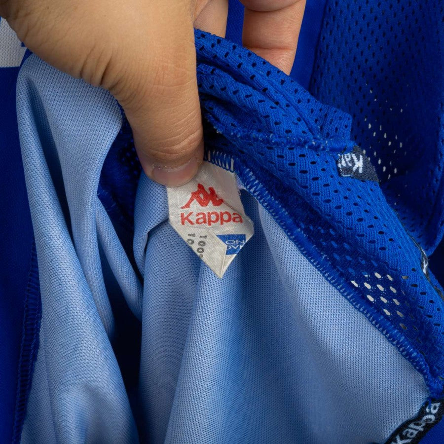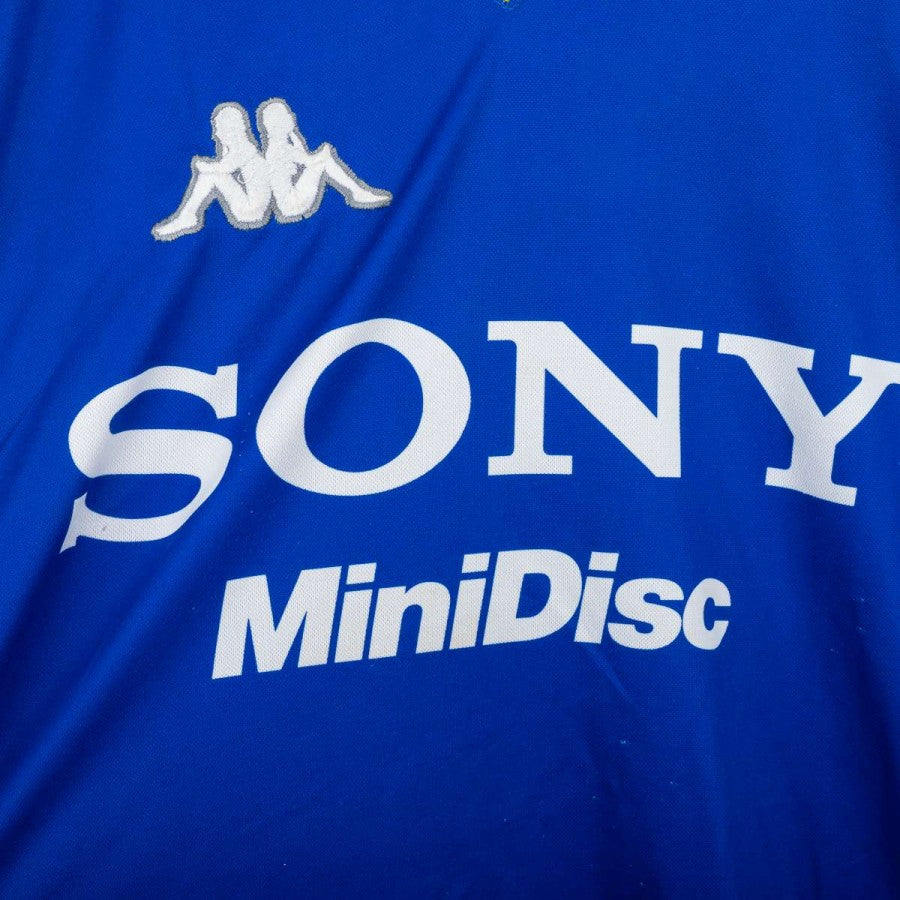 Maglia away Juventus della stagione 1997/1998 realizzata da Kappa. Storica versione da trasferta a maniche lunghe di colore blu con dettagli gialli e bianchi. Sponsor centrale "Sony MiniDisc" stampato in bianco. Logo Kappa ricamato sul petto destro e stemma Juventus ricamato sulla manica sinistra con due stelle. Colletto giallo a V con dettagli elastici gialli sui polsini. Nome "DEL PIERO" e numero 10 applicati sul retro in giallo. Vestibilità regolare, modello GARA della linea Kappa. Taglia L. Prodotto ufficiale Kappa, fornitore tecnico Juventus.