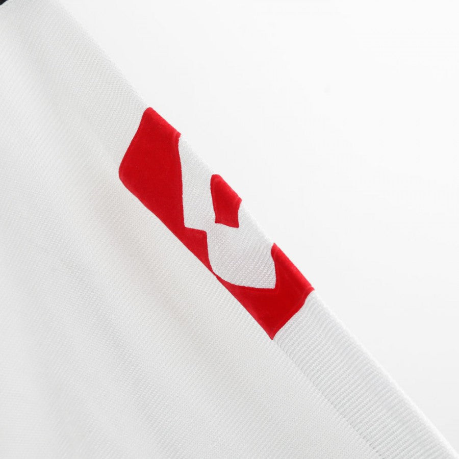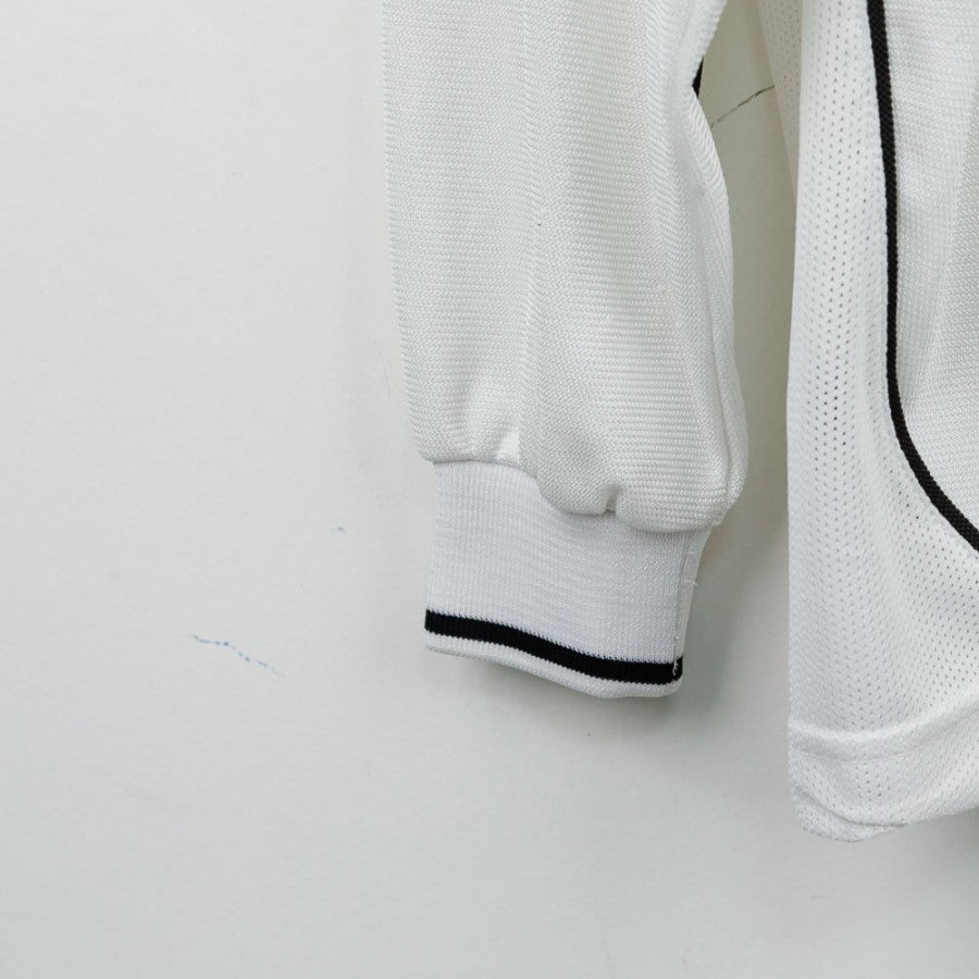Maglia Away Juventus Lotto Del Piero 10 ML 2002/2003. Prodotta da Lotto, presenta lo sponsor commerciale Fastweb in nero e giallo al centro del petto, affiancato dal logo tecnico e dallo stemma del club con due stelle. Lo scudetto tricolore è applicato con orgoglio sul lato sinistro, simbolo del titolo vinto nella stagione precedente. Il design è elegante, su base bianca con finiture nere e cuciture curve a contrasto. Sul retro sono presenti il nome Del Piero e il numero 10. La maglia ha maniche lunghe e la taglia indicata è M.