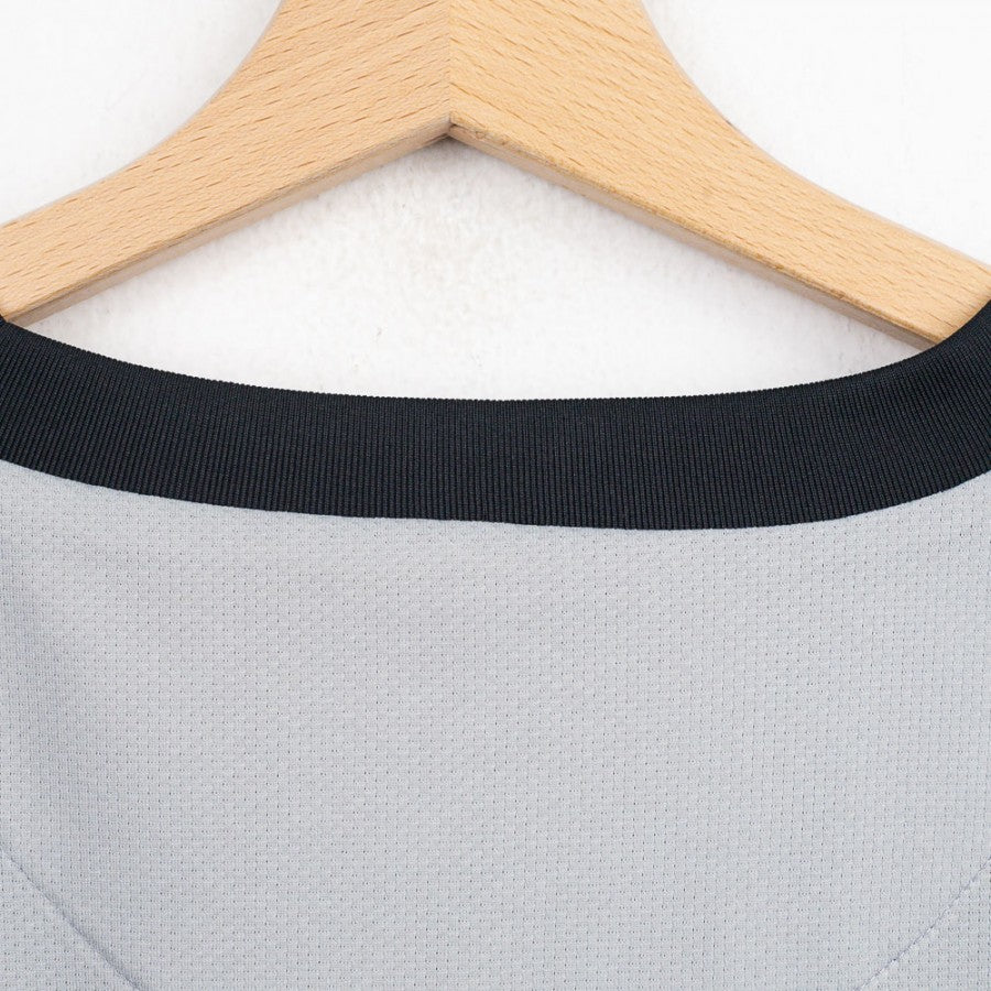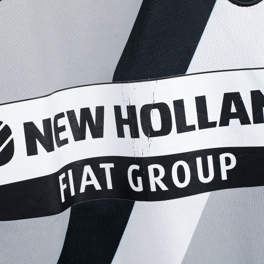 Maglia Away Juventus Nike Trezeguet 17 2009/2010. Prodotto originale dell'epoca, con sponsor tecnico Nike e sponsor commerciale New Holland. Taglia non visibile chiaramente nelle immagini. La divisa si distingue per il suo design grigio con fascia diagonale nera e bianca sul petto, uno stile unico per la stagione. Sul retro è presente il nome e numero 17 di David Trezeguet, uno dei bomber più iconici della storia bianconera.