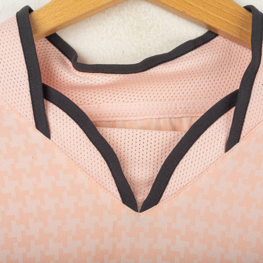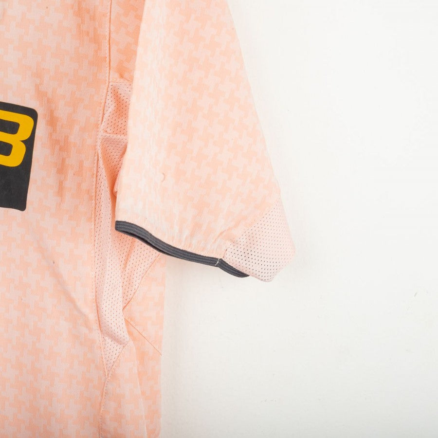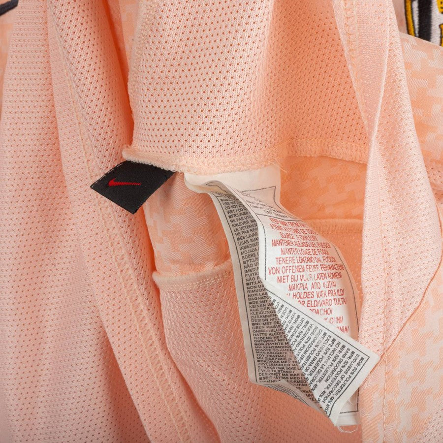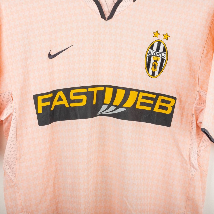 Maglia away della Juventus prodotta da Nike per la stagione 2003/2004, personalizzata con il nome Zambrotta e il numero 19. Modello iconico di colore rosa con pattern geometrico tono su tono, sponsor tecnico Nike ricamato e sponsor commerciale Fastweb stampato al centro. Stemma Juventus ricamato lato cuore con due stelle sovrastanti. Sul retro nome “ZAMBROTTA” e numero 19 in nero. Vestibilità regolare. Taglia L.