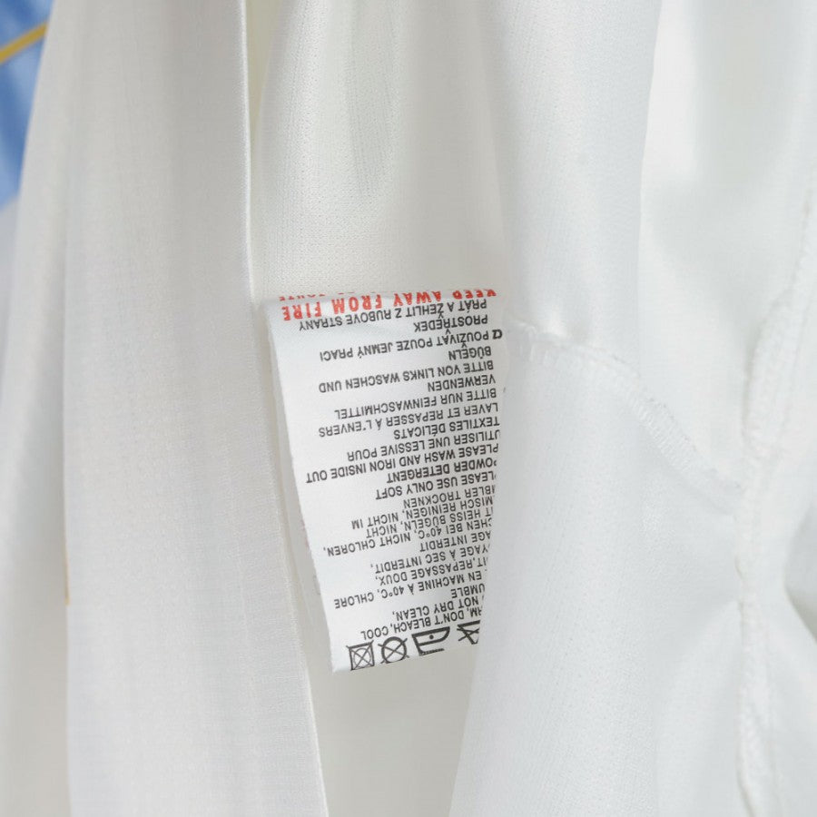 Maglia Away ufficiale della Lazio per la stagione 1999/2000, prodotta dallo sponsor tecnico Puma. Il design presenta una base bianca con dettagli celesti sulle spalle e sulle maniche, impreziositi da rifiniture gialle. Lo stemma della Lazio è cucito sul petto, con il logo Puma ricamato su entrambi i lati e lo sponsor commerciale Cirio stampato al centro. Sul retro è personalizzata con il nome Stankovic e il numero 20. Taglia M.