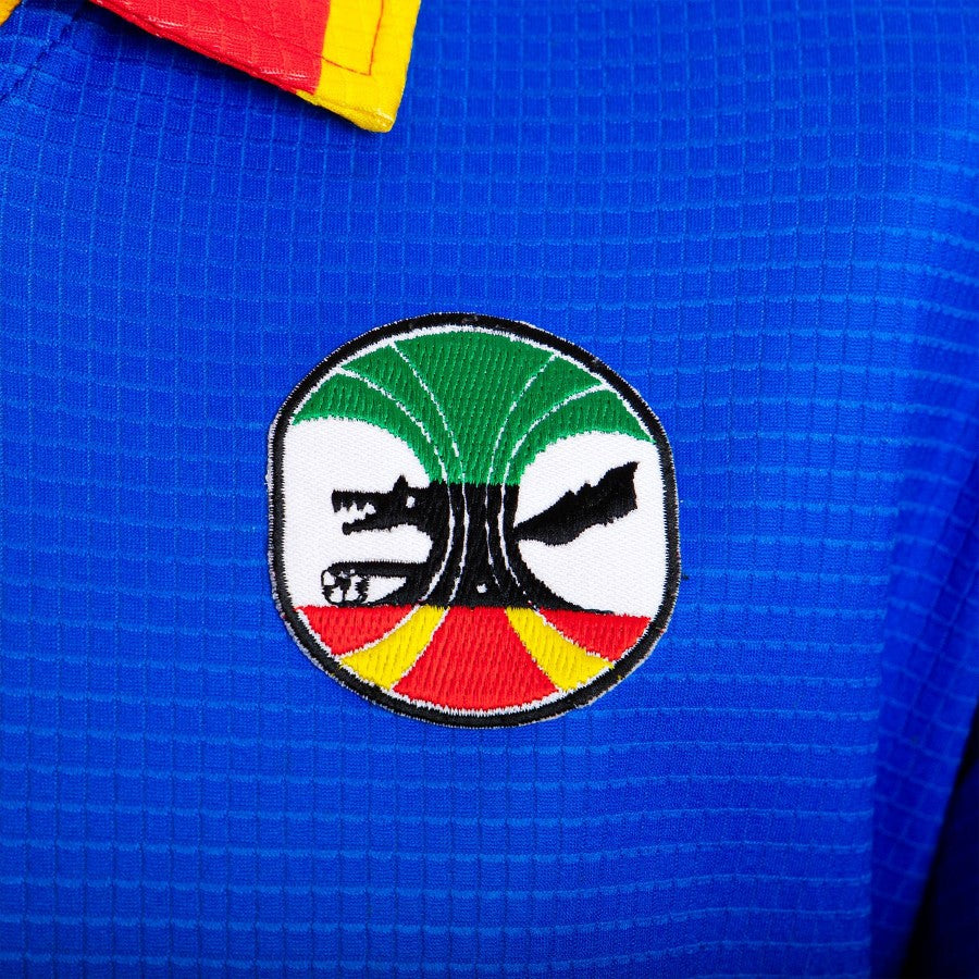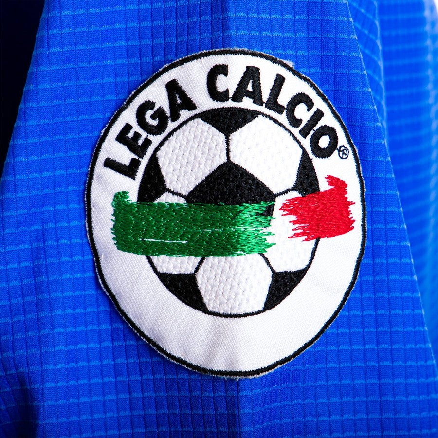 Maglia gara vintage anno 97-98, nome e numero Piangerelli 4 applicati in bianco sul retro. Colori vividi e toppe tenute in maniera esemplare. Sponsor tecnico Asics cucito nella giuntura del colletto, sponsor commerciale Banca del Salento sublimatico al centro, logo Lecce applicato lato cuore, toppa Lega Calcio cucita sulla manica destra.