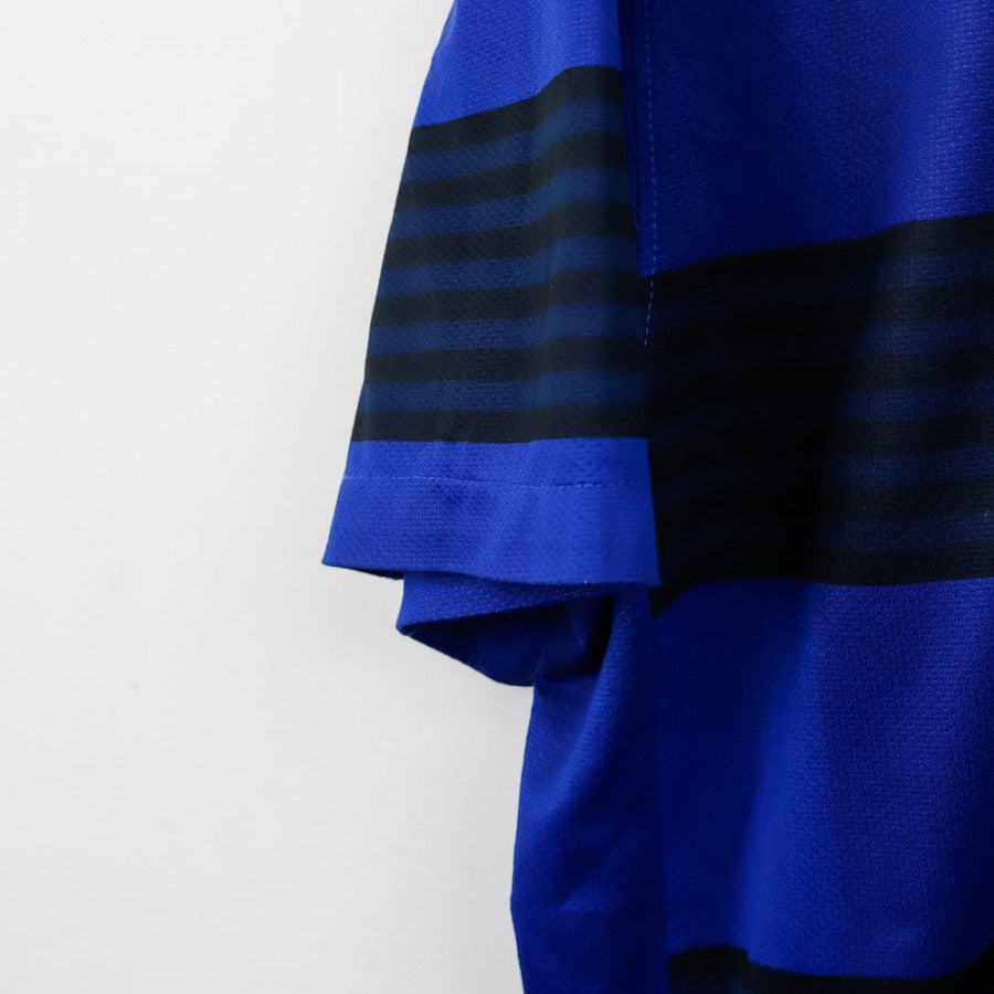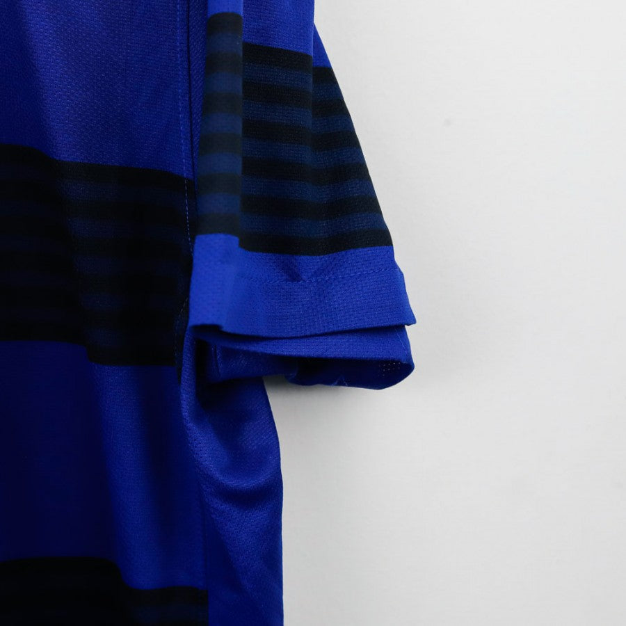 Maglia Away del Manchester United indossata nella stagione 2011/2012, realizzata da Nike e dedicata a Wayne Rooney con il numero 10. Il logo tecnico Nike è visibile sul petto, insieme allo stemma ufficiale del club e allo sponsor commerciale Aon in posizione centrale. Il design è caratterizzato da una grafica a bande orizzontali blu e nere, con dettagli neri sul colletto. Taglia XL indicata sull'etichetta interna.