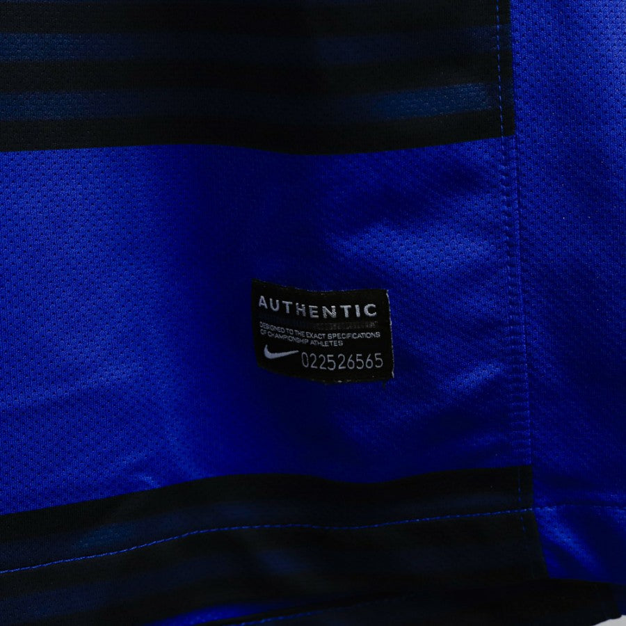 Maglia ufficiale Away del Manchester United, stagione 2011/2012, personalizzata con il nome di Wayne Rooney e il numero 10. Questo modello, prodotto dallo sponsor tecnico Nike, presenta un design a righe orizzontali blu e nere, con lo stemma del club ricamato sul lato cuore e il logo Nike a destra. Al centro della maglia si trova lo sponsor commerciale Aon in bianco. Sul retro, il nome "Rooney" e il numero "10" sono stampati in bianco. La maglia, di taglia L, fa parte di una delle stagioni più competitive del club inglese.
