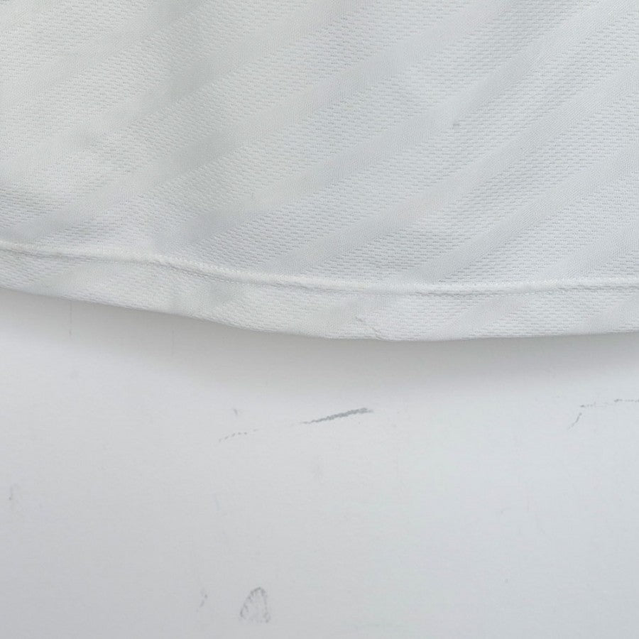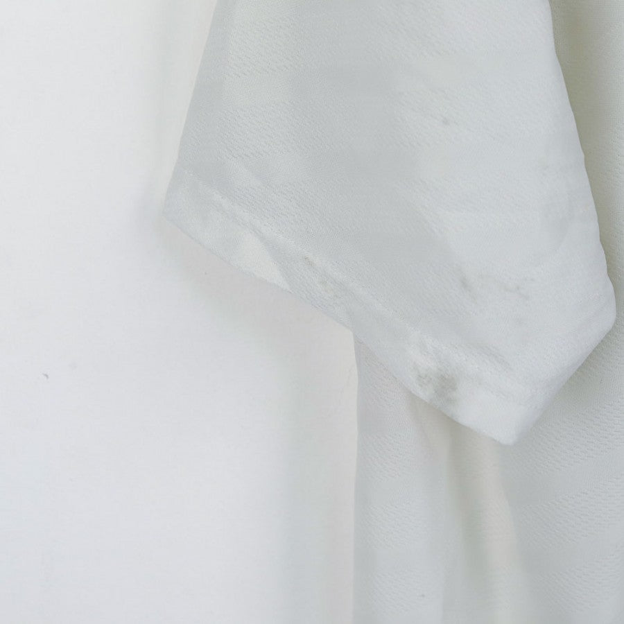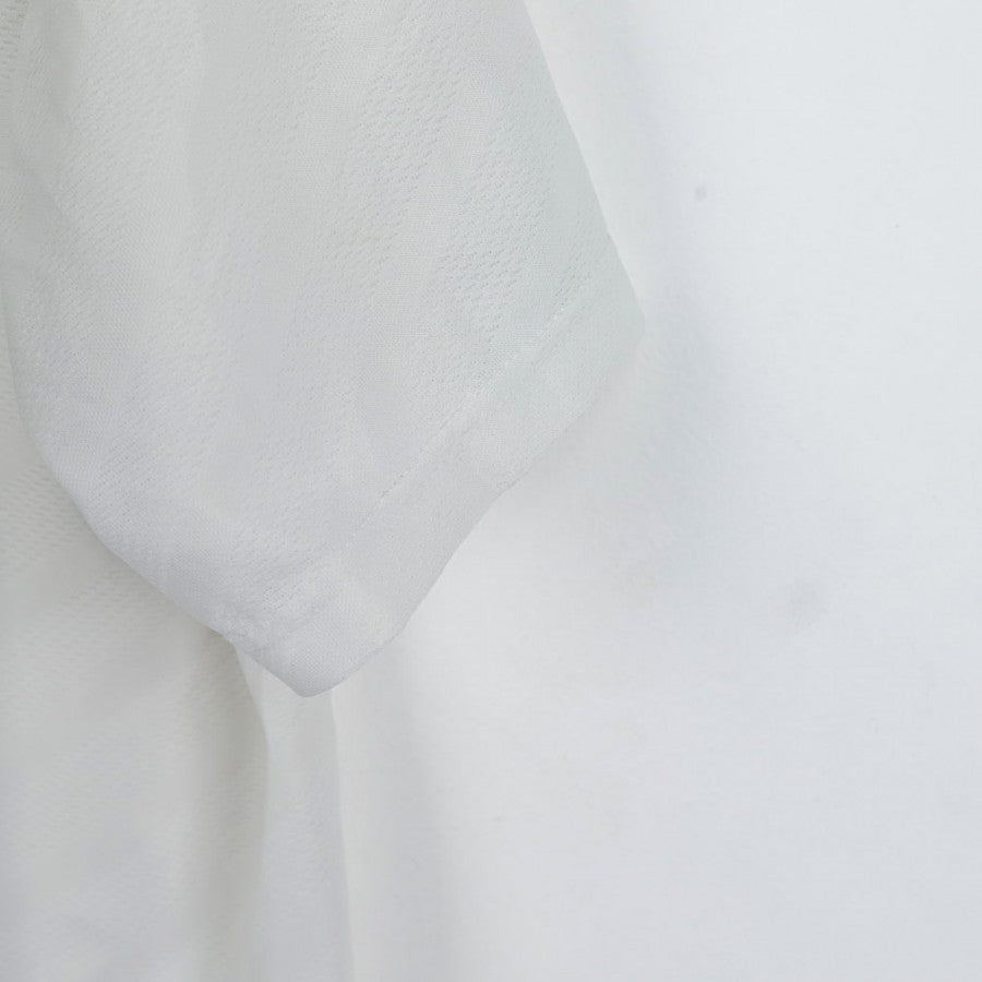 Maglia da trasferta ufficiale del Manchester United per la stagione 1996/1997, prodotta dallo sponsor tecnico Umbro e personalizzata con il nome e il numero 7 di Eric Cantona. Il design è caratterizzato da una base bianca con dettagli neri e rossi, il colletto a polo con rifiniture tricolori e il logo dello sponsor commerciale Sharp Viewcam al centro del petto. Lo stemma del Manchester United è cucito sul petto, mentre il logo Umbro è posizionato sopra di esso. Sul retro, la stampa Cantona 7 in caratteri neri con bordi rossi completa il look iconico. Taglia XL.