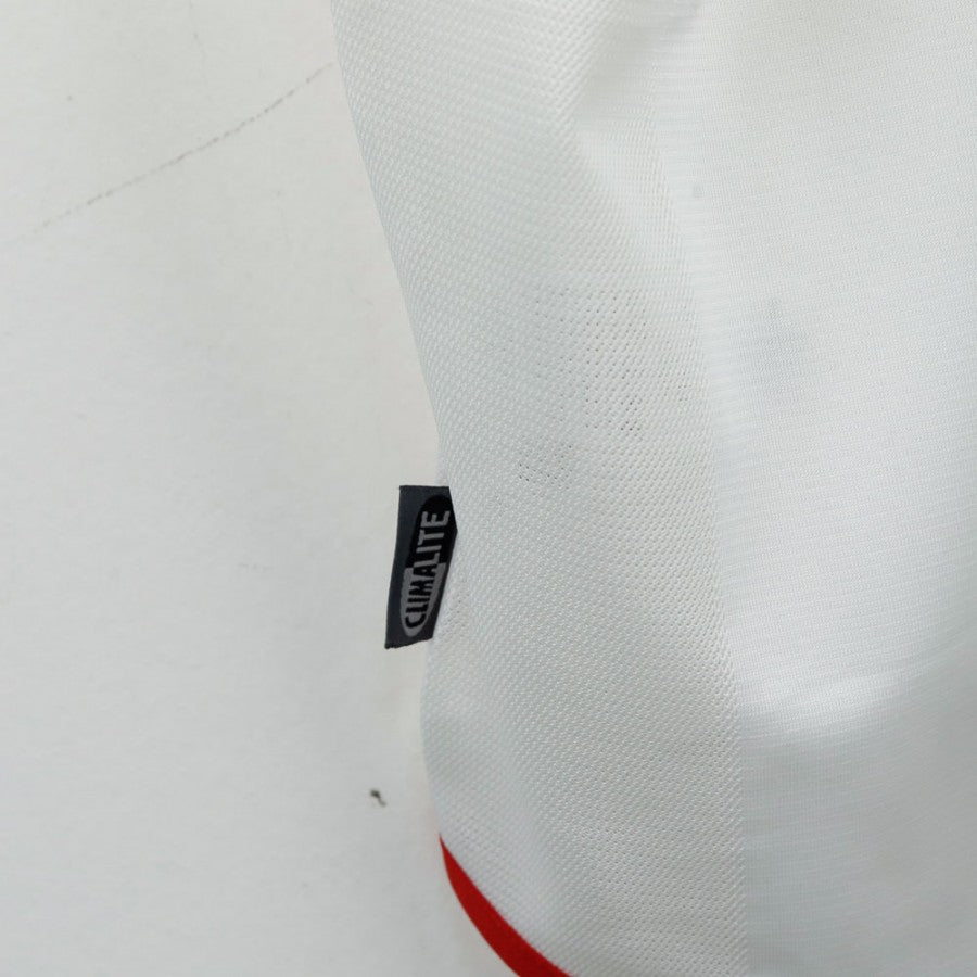 Maglia Away Milan Adidas Kakà 22 2003/2004. Prodotta da Adidas, presenta lo stemma del Milan con stella dorata sul petto e il logo tecnico sulla parte opposta, con lo sponsor commerciale Opel Meriva al centro. Il design è raffinato: base bianca con colletto a polo rosso e dettagli neri, completata da finiture rosse su maniche e bordi. Sul retro sono presenti il nome Kakà e il numero 22. La taglia indicata è L.