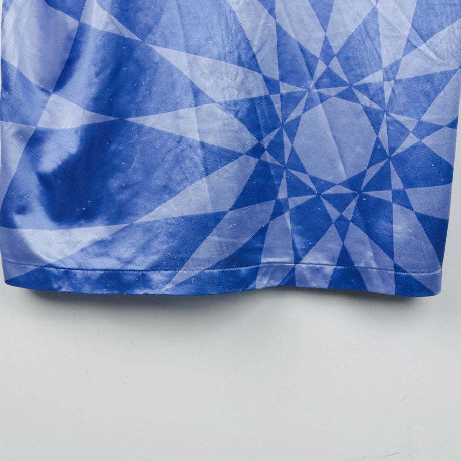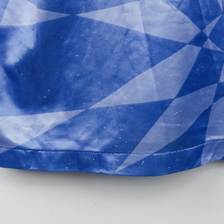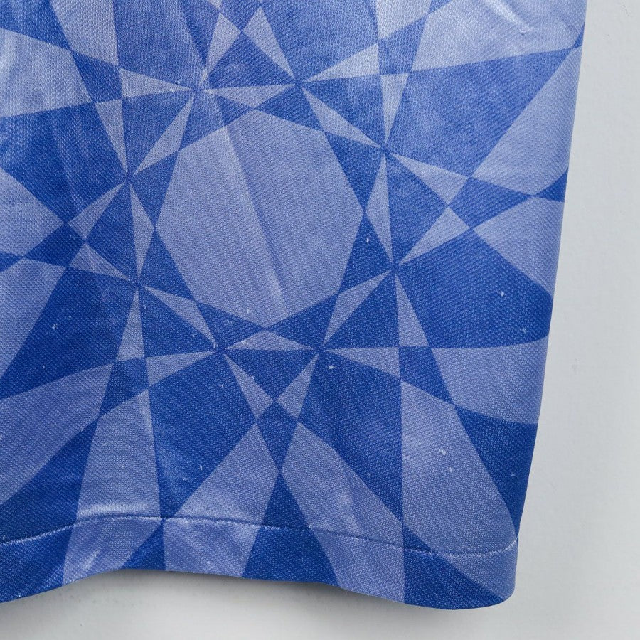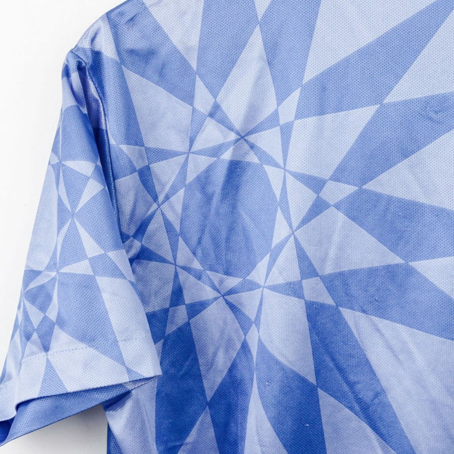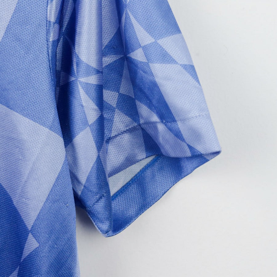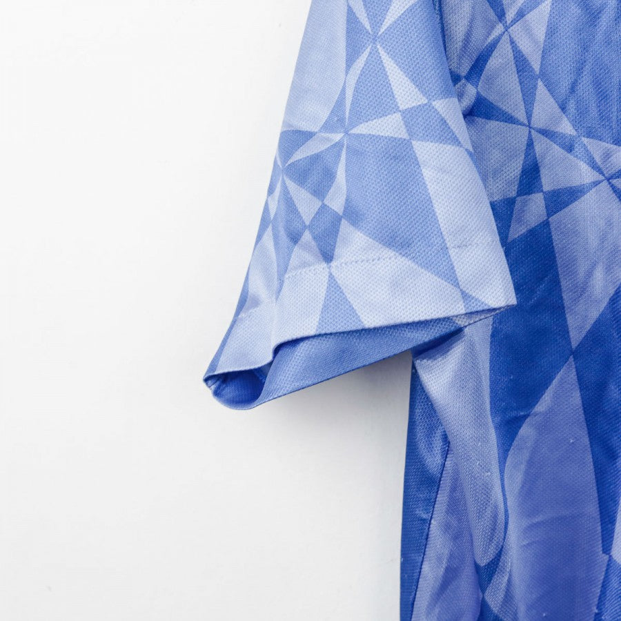 Maglia away ufficiale dei Mitsubishi Urawa Red Diamonds per la stagione 1993/1994, prodotta da Mizuno. La divisa si distingue per il suo spettacolare design geometrico in diverse tonalità di blu, che conferisce un aspetto dinamico e moderno. Sul petto sono presenti il logo Mizuno e lo stemma della squadra, mentre lo sponsor principale "MITSUBISHI URAWA" è stampato in bianco al centro. Sulla manica è cucito il logo ufficiale della J.League, a testimonianza dell'ingresso del club nel massimo campionato giapponese.