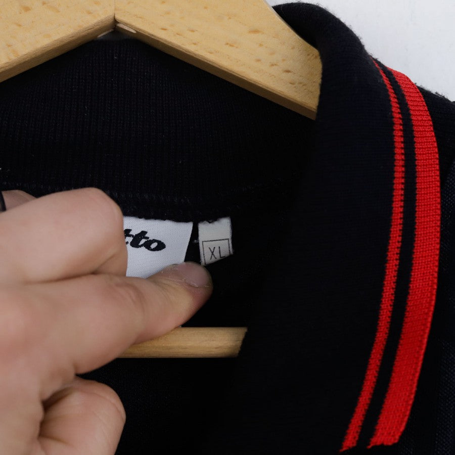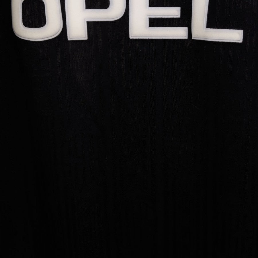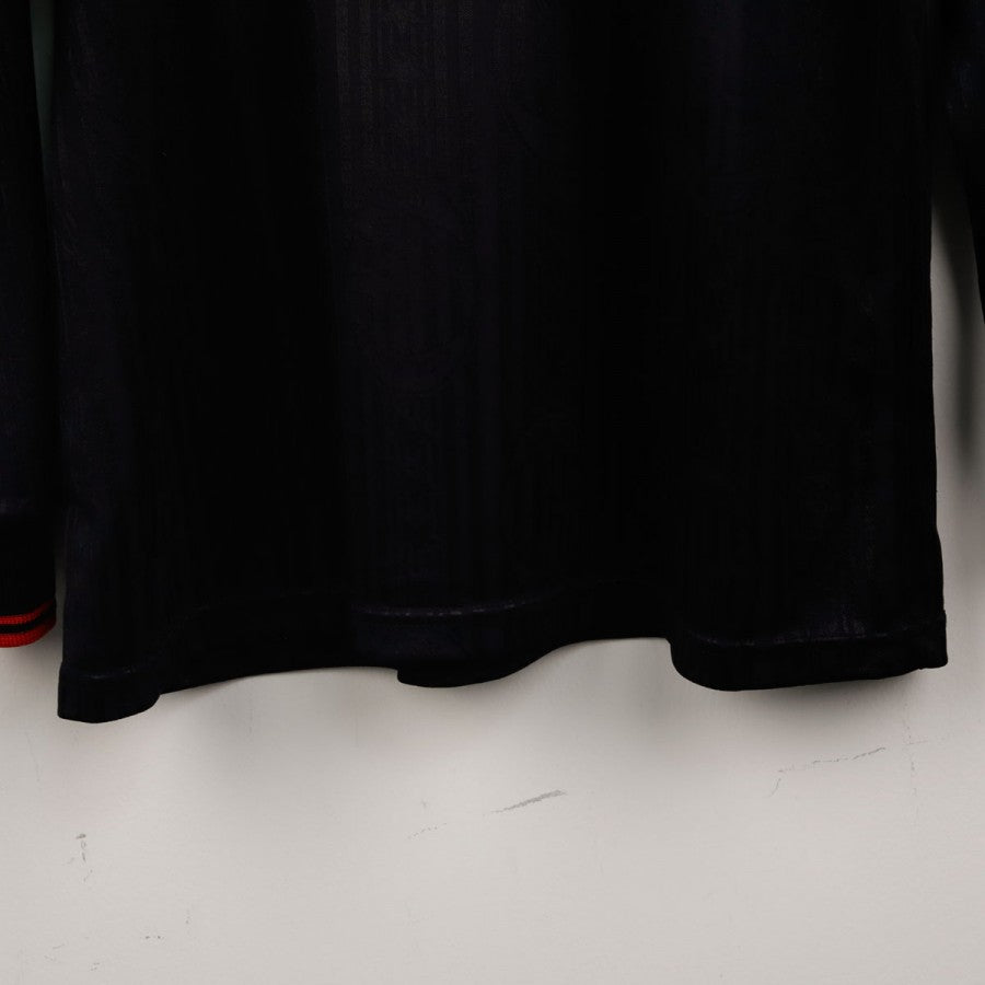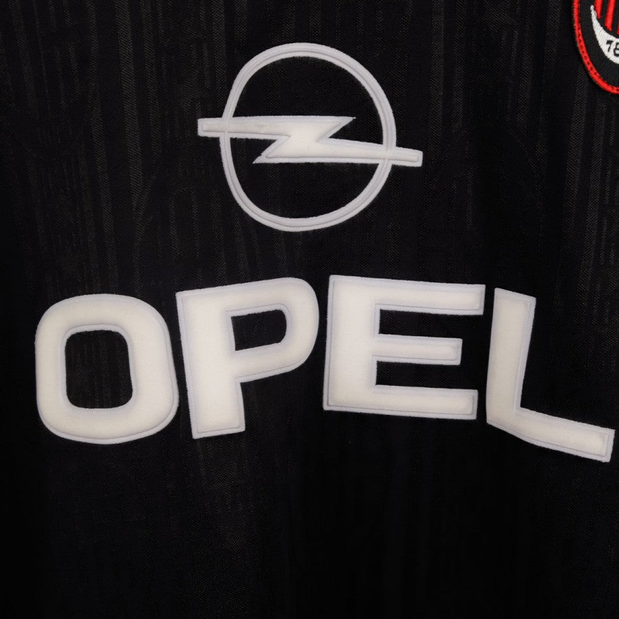 Maglia Away ufficiale del Milan, stagione 1997/1998, con personalizzazione Paolo Maldini numero 3. Modello a maniche lunghe, caratterizzato dal colore nero con dettagli rossi. Lo stemma del Milan è posizionato sul lato cuore con una stella sopra, simbolo della decima vittoria in campionato. Il logo Lotto è presente sia sul petto che sulla parte inferiore del numero sul retro. Lo sponsor commerciale Opel è applicato al centro della maglia. La taglia è XL.