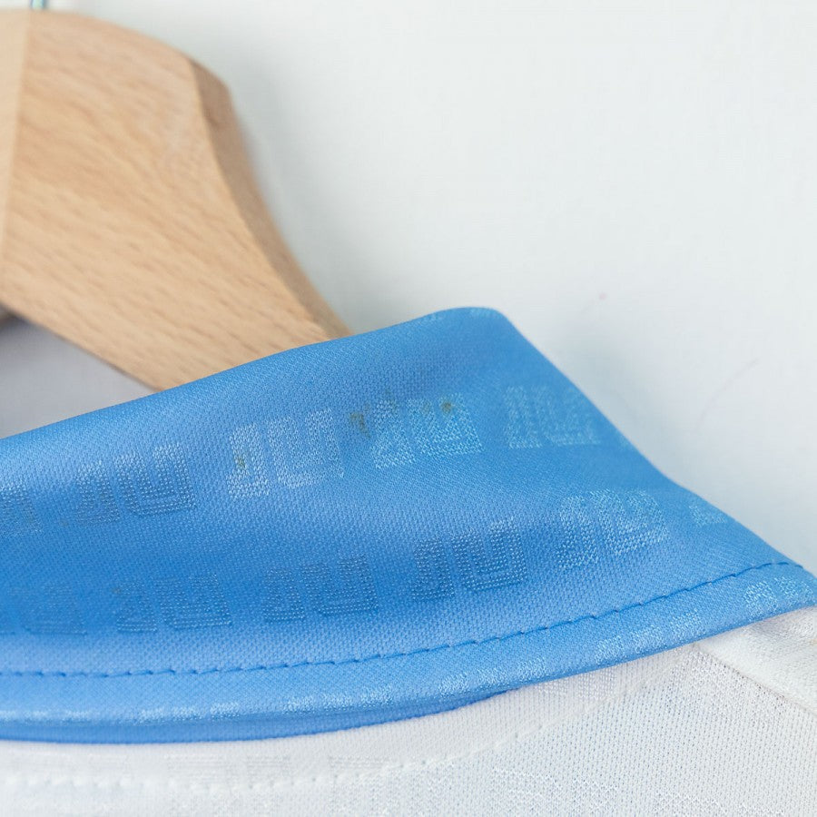 Maglia away S.S.C. Napoli realizzata dallo sponsor tecnico Ennerre per la stagione 1990/1991. Questo particolare modello di colore bianco con colletto polo e inserti sul petto azzurri fu usata in Coppa Italia contro la Sampdoria. Presenta la Patch dello scudetto per la vittoria dell'anno precedente sul petto lato cuore, logo dello sponsor tecnico Ennerre a destra cucito, sponsor commerciale Mars in rosso al centro e stemma della squadra ricamato sulla manica. Taglia XL.