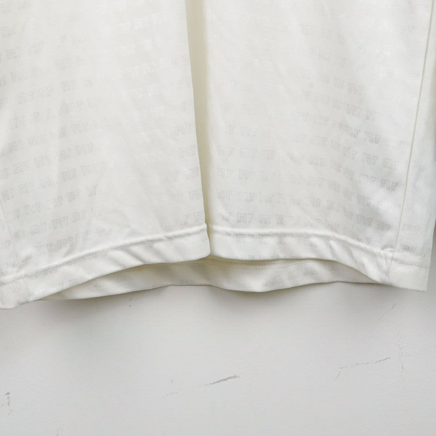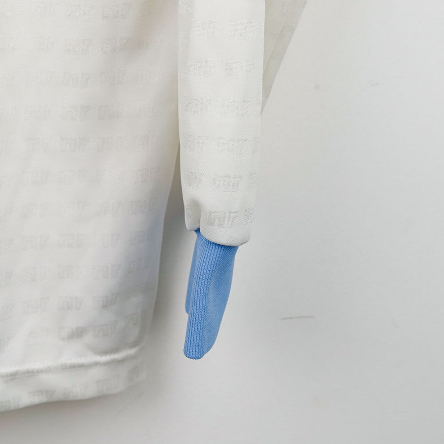 Maglia Away Napoli Ennerre ML 1990/1991. Realizzata da Ennerre, presenta lo storico sponsor commerciale Mars in rosso al centro del petto, accompagnato dallo scudetto tricolore, simbolo dello storico secondo scudetto conquistato dal club. Il design bianco è impreziosito da una fascia diagonale celeste con motivi geometrici tono su tono. Il logo del Napoli è visibile sulla manica sinistra, mentre quello tecnico Ennerre compare sul lato destro del petto. La taglia indicata è M e le maniche sono lunghe.