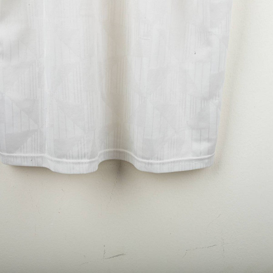 Maglia away ufficiale della S.S.C. Napoli, stagione 1991/1992, prodotta da Umbro in versione Repli-Kit. Design iconico con base bianca e grafica a raggi viola e azzurri su spalle e maniche. Colletto polo azzurro con bordino bianco e viola. Logo Umbro: stampato in sublimatico sul petto destro. Stemma Napoli: patch in tessuto applicata lato cuore, con scritta “Società Sportiva Calcio Napoli” e “N” centrale azzurra. Sponsor Voiello: stampato in sublimatico sul petto.