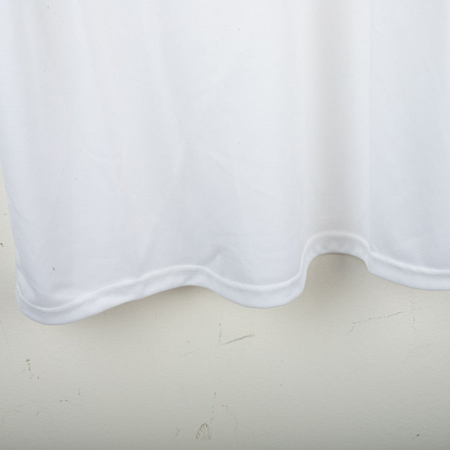 Maglia ufficiale away del Parma A.C. prodotta da Champion per la stagione 2002/2003, con personalizzazione Adriano numero 9. Design bianco con inserti blu e gialli, strisce Champion sulle maniche e patch celebrativa “90 anni Parma” (1913-2003). Logo Champion applicato sul petto destro e stemma Parma A.C. lato cuore, con coccarda tricolore cucita. Sponsor centrale Parmalat stampato in blu. Colletto a V con dettagli blu e gialli. Maglia realizzata in 100% poliestere, taglia XL.