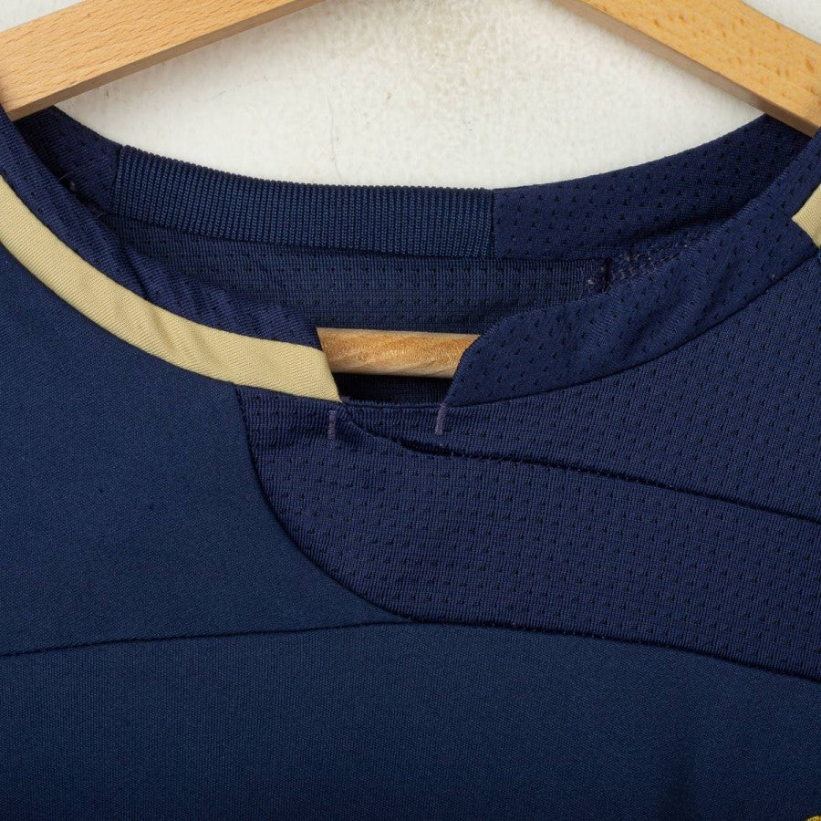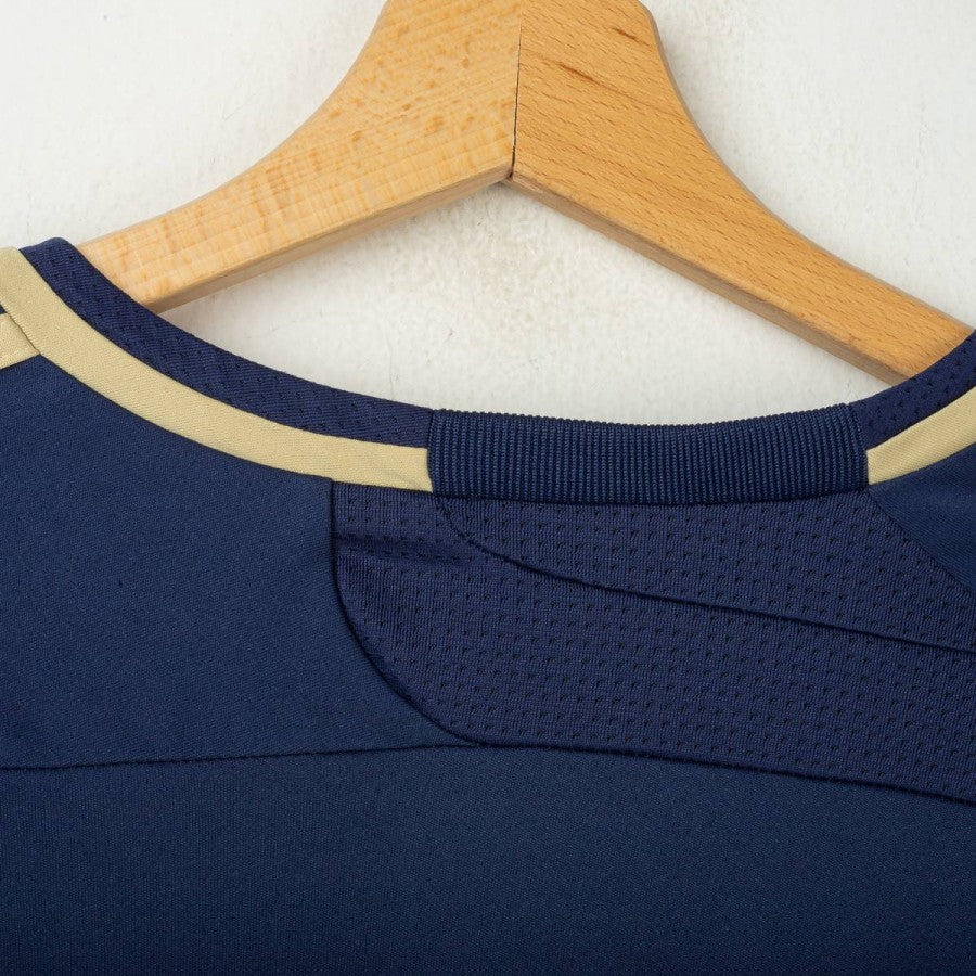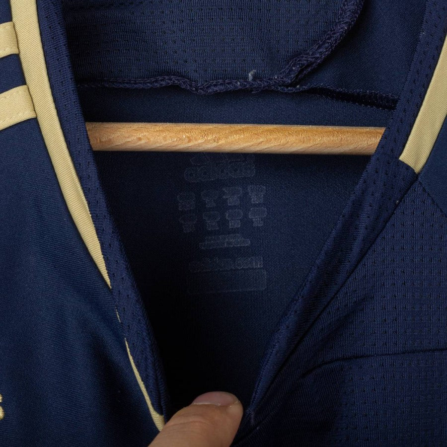 Maglia away del Real Madrid realizzata da Adidas per la stagione 2007/2008. Modello a manica corta di colore blu navy con dettagli oro sulle spalle e logo Adidas ricamato. Sponsor tecnico Adidas e sponsor commerciale “Bwin.com” stampato sul petto. Stemma del Real Madrid ricamato lato cuore. Patch ufficiale LFP cucita sulla manica destra. Vestibilità regolare. Taglia L.