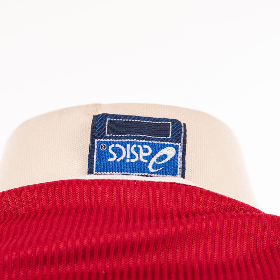 Stemma della società sportiva e marchio dello sponsor commerciale Exigo applicati sul petto e marchio dello sponsor tecnico Asics leggibile sul lato destro.