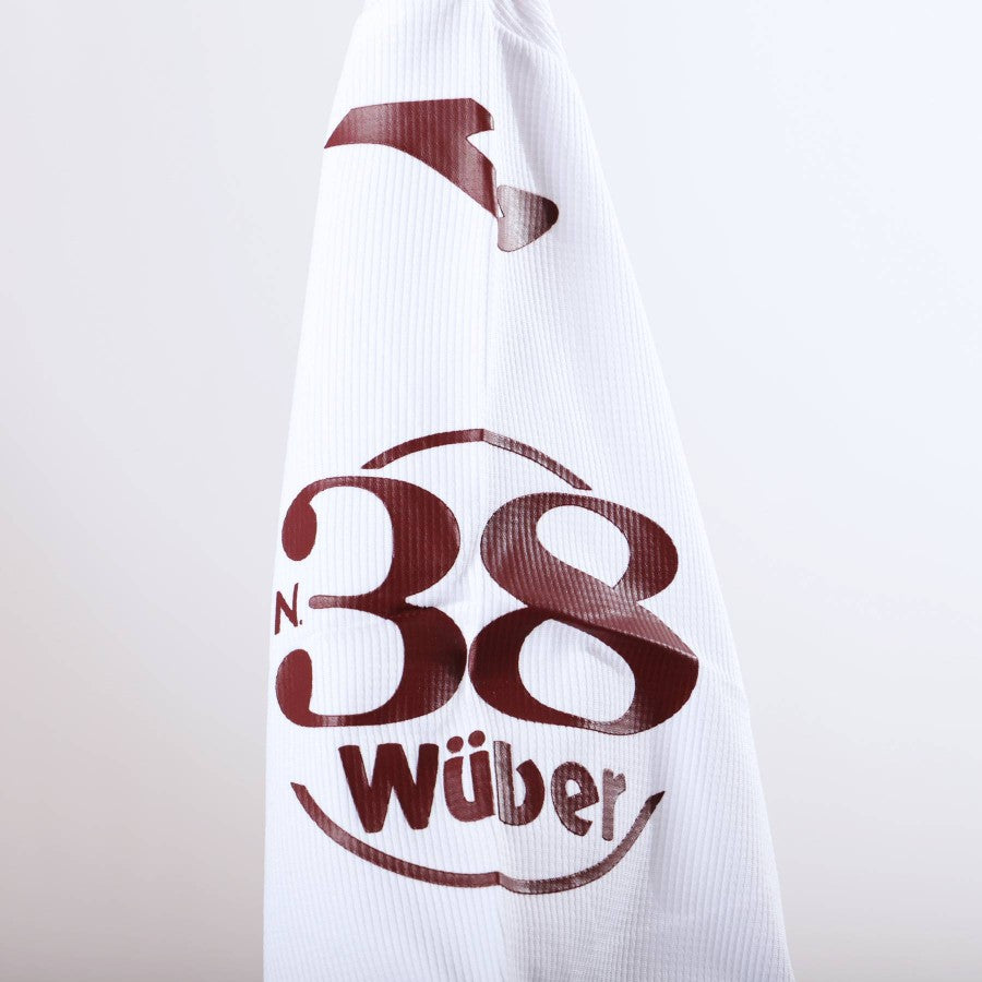 Seconda maglia del Torino dell'annata 2021/2022, di colore bianco con dettagli in bordeaux, scollo a V con inserti elastici. Sulla parte frontale notiamo subito una striscia obliqua in stampa sublimatica con lo sponsor commerciale Suzuki. L'altro sponsor, Beretta, è applicato in plastica leggera sulla destra. La patch del Torino è ricamata lato cuore e lo sponsor tecnico Joma, sulla destra. Sul retro sono stampata lettering Rodriguez ed il numero 13. Completa la maglia la toppa di Serie A sulla manica destra.