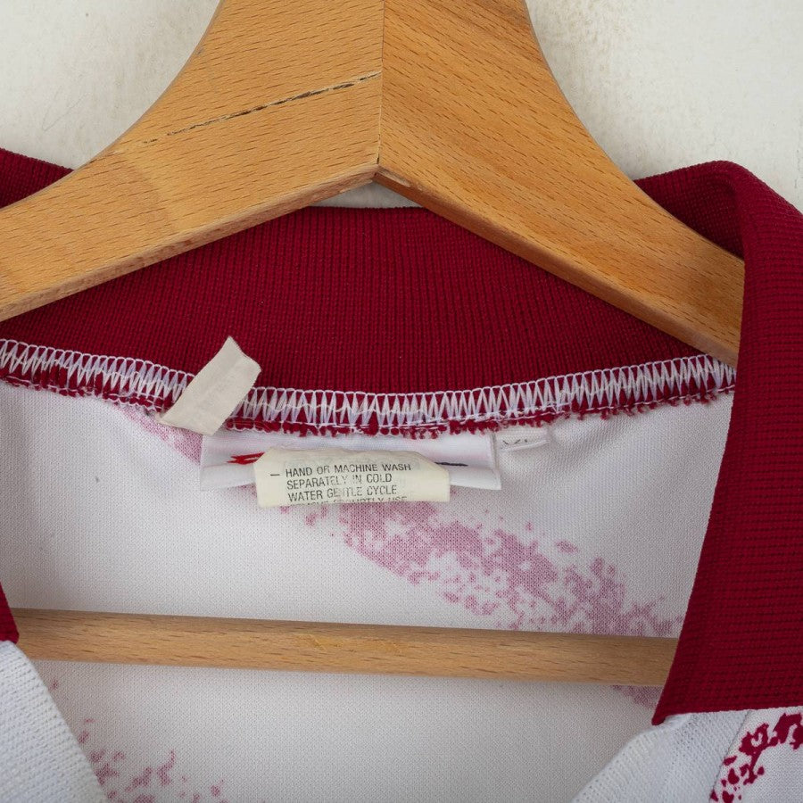 Maglia ufficiale away del Torino FC prodotta da Lotto per la stagione 1993/1994. Design bianco con grafiche diagonali granata effetto pennellata, colletto e bordi maniche in contrasto granata. Logo Lotto ricamato sul petto destro e stemma storico del Torino cucito lato cuore, accompagnato dal tricolore che celebra la Coppa Italia 1992/1993. Sponsor “Beretta” stampato al centro. Tessuto tecnico leggero e traspirante in poliestere. Maglia originale Lotto d'epoca, simbolo di un periodo iconico della squadra granata negli anni '90. Taglia XL.