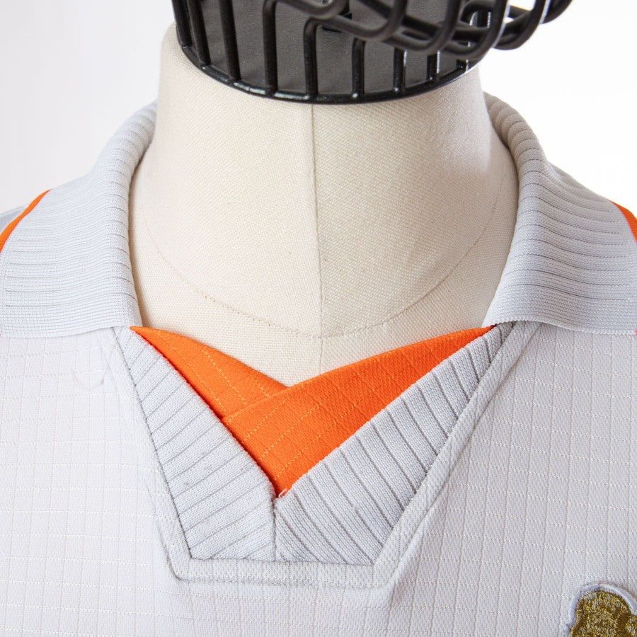 Seconda maglia del Venezia con manica lunga e colletto a polo. Colori bianco, verde e dettagli in arancio. Patch del Club cucita e logo Kronos applicato in vellutino. Sulla manica destra è cucita la patch della Lega calcio e sul retro è stampata la personalizzazione ORLANDINI 20 in plastica leggera color arancio. Lo sponsor commerciale è Emmezeta.