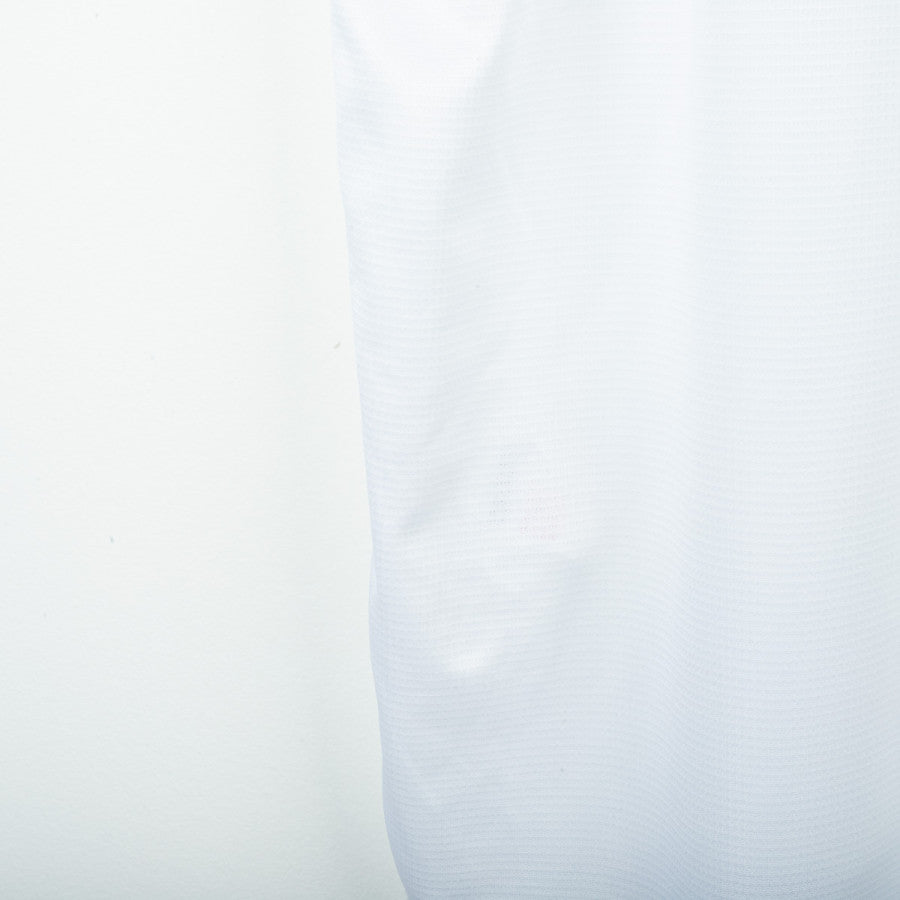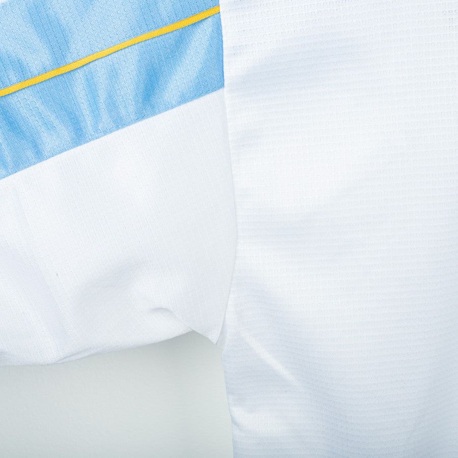 Maglia Centenario della S.S. Lazio utilizzata nella stagione 2000/2001, prodotta da Puma. Colore bianco con spalle celesti e dettagli gialli su colletto e maniche. Logo Puma al centro del petto, stemma Lazio in versione speciale “1900–2000” cucito lato cuore e sponsor CIRIO applicato in stampa gommata. Scudetto tricolore cucito sul petto in onore del titolo vinto nella stagione precedente. Nome Nesta e numero 13 sul retro in flock nero. Colletto a polo con scritta “S.S. LAZIO” all'interno. Tessuto tecnico Puma con trama a nido d'ape, leggero e traspirante. Taglia XL.