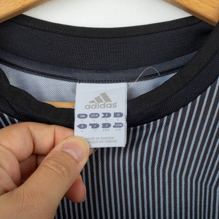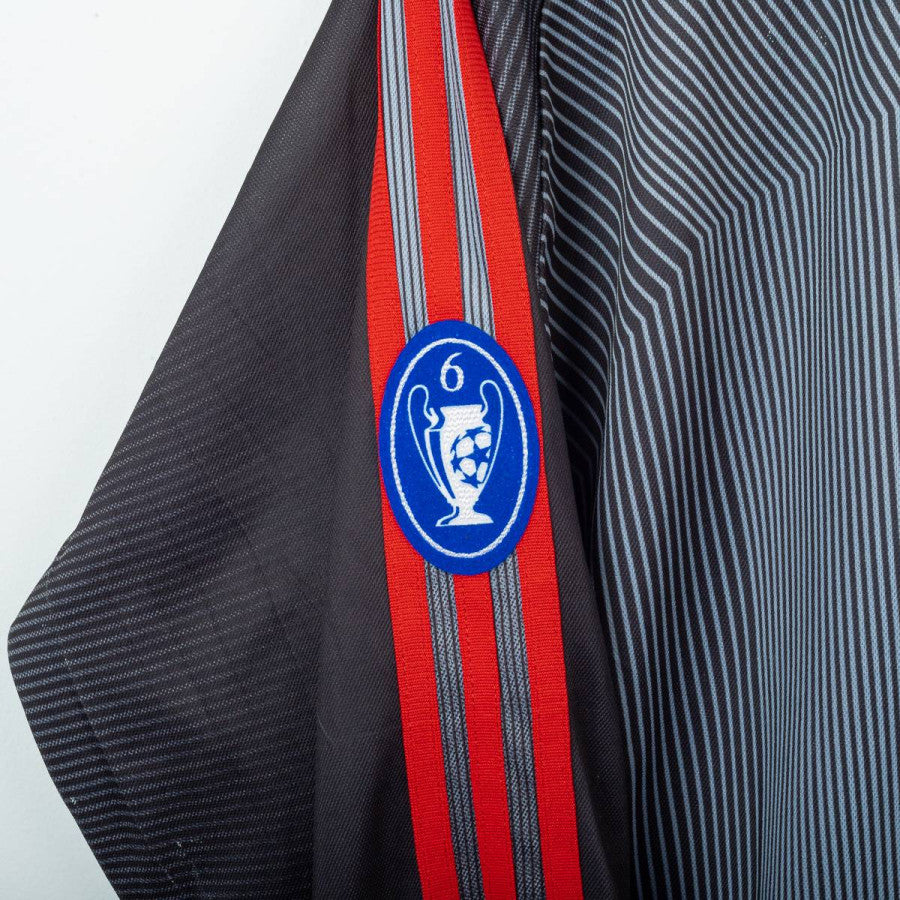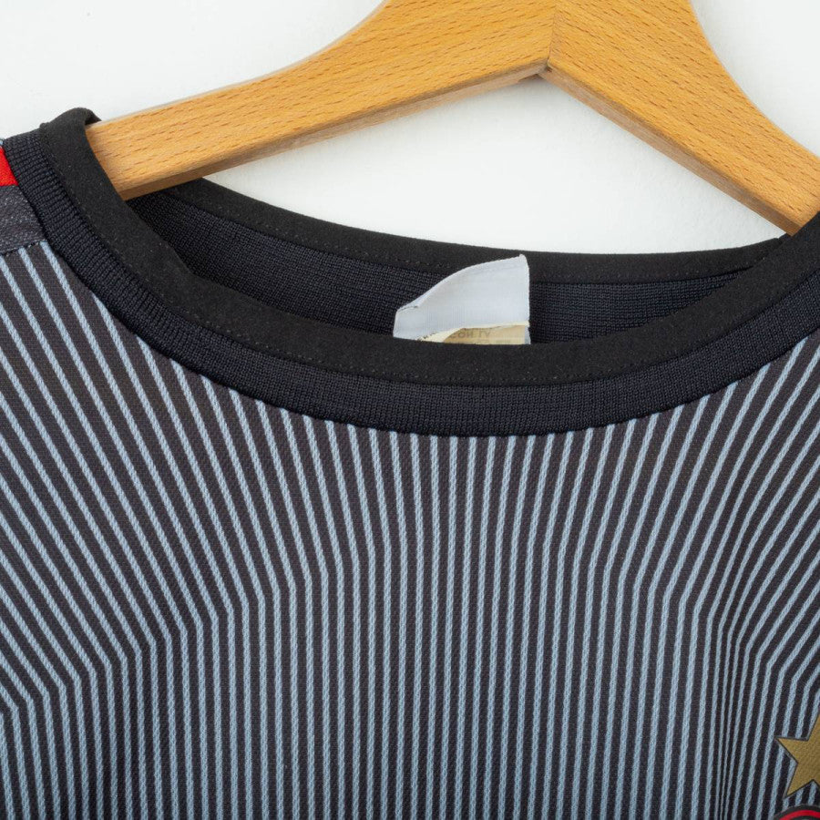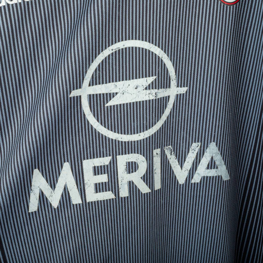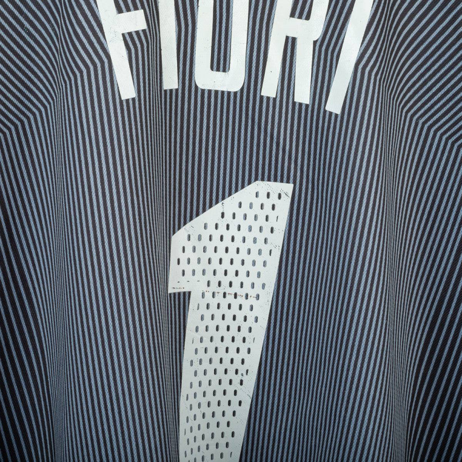 Completo da portiere del Milan utilizzato nella stagione 2003/2004, prodotto da Adidas. Maglia a maniche lunghe di colore grigio scuro sfumato con pinstripe verticali, colletto nero e classiche tre strisce rosse sulle maniche. Logo Adidas e sponsor “Opel Meriva” stampati in bianco sul petto. Stemma AC Milan applicato lato cuore con stella oro e coccarda tricolore stampata. Patch Lega Calcio sulla manica e patch Champions League “6”. Nome e numero “Fiori 1” stampati in bianco sul retro. Pantaloncini neri con imbottiture laterali, logo Adidas e stemma Milan applicati, numero 1 bianco stampato. Vestibilità regolare, tessuto tecnico ClimaLite traspirante. Taglia L. La Maglia appartiene alla collezione personale di un ex fotografo di campo. Il COA sarà inviato con l'acquisto della maglia.
