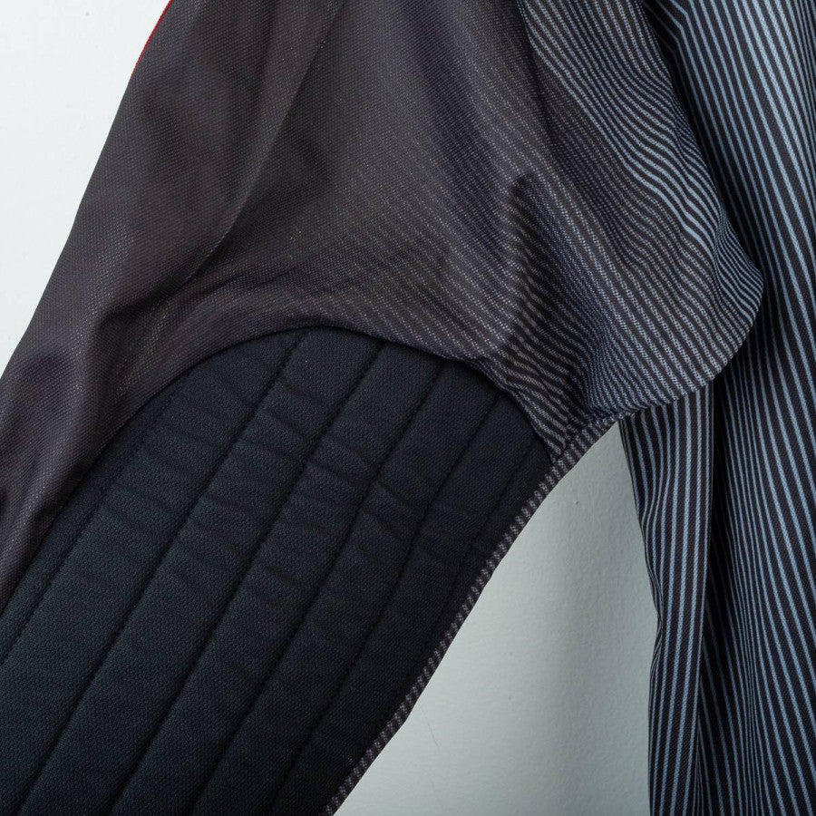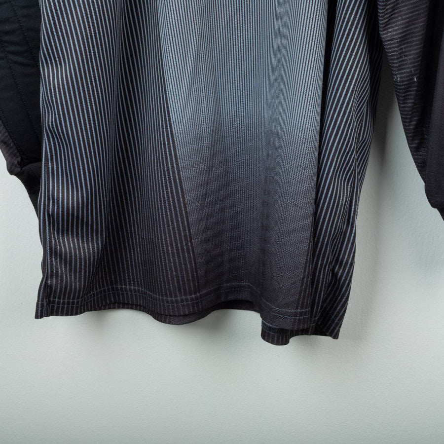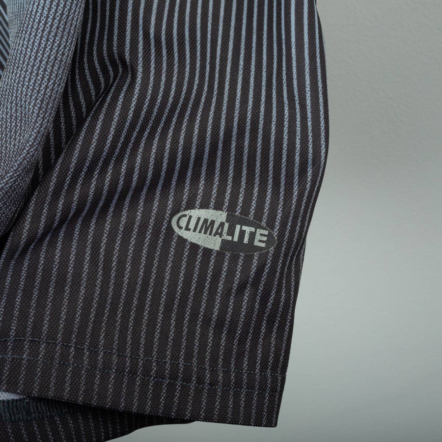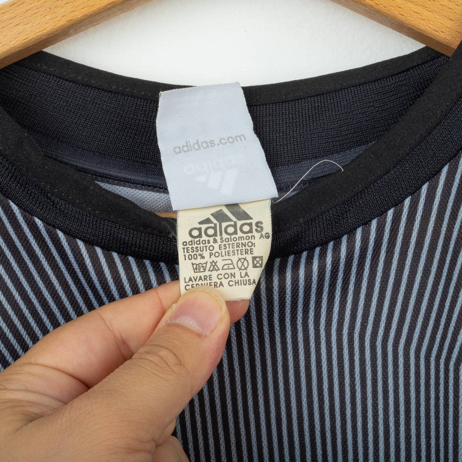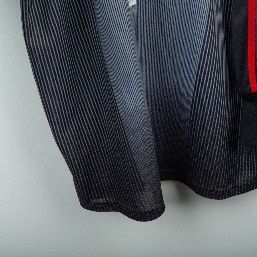 Completo da portiere del Milan utilizzato nella stagione 2003/2004, prodotto da Adidas. Maglia a maniche lunghe di colore grigio scuro sfumato con pinstripe verticali, colletto nero e classiche tre strisce rosse sulle maniche. Logo Adidas e sponsor “Opel Meriva” stampati in bianco sul petto. Stemma AC Milan applicato lato cuore con stella oro e coccarda tricolore stampata. Patch Lega Calcio sulla manica e patch Champions League “6”. Nome e numero “Fiori 1” stampati in bianco sul retro. Pantaloncini neri con imbottiture laterali, logo Adidas e stemma Milan applicati, numero 1 bianco stampato. Vestibilità regolare, tessuto tecnico ClimaLite traspirante. Taglia L. La Maglia appartiene alla collezione personale di un ex fotografo di campo. Il COA sarà inviato con l'acquisto della maglia.