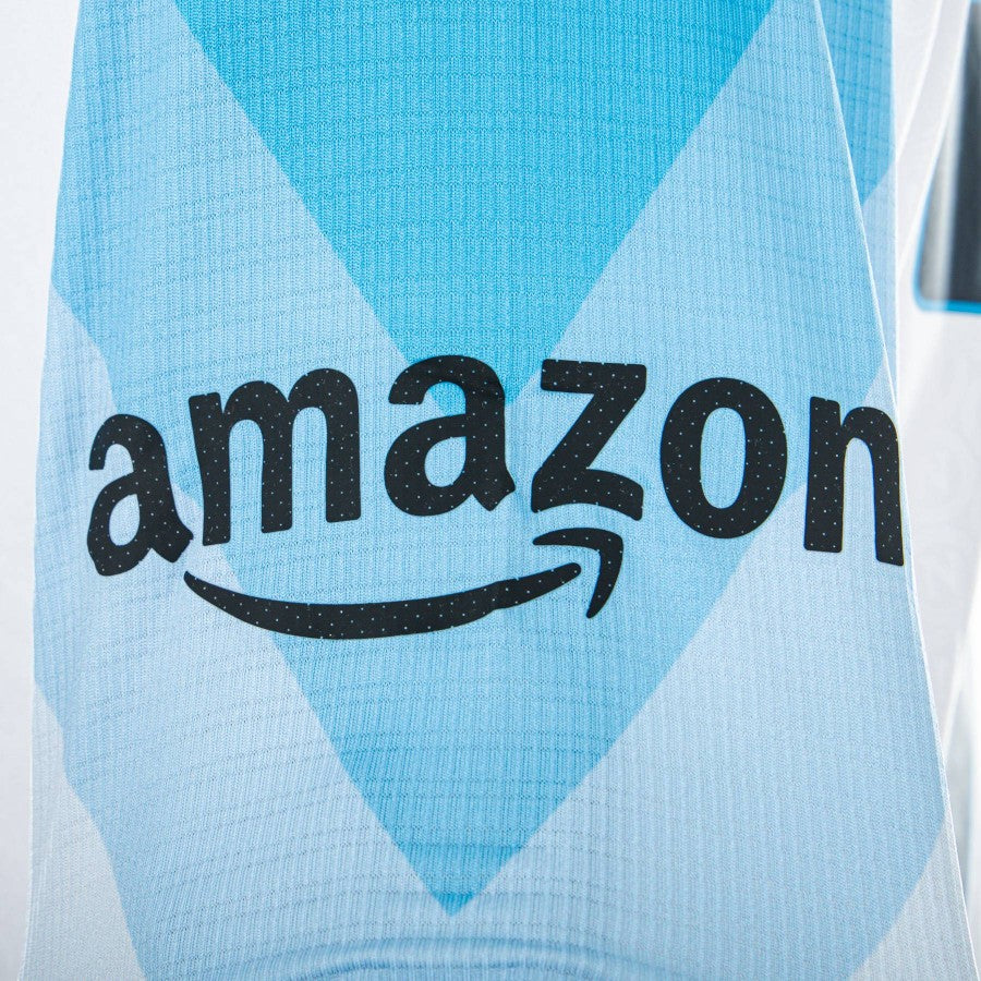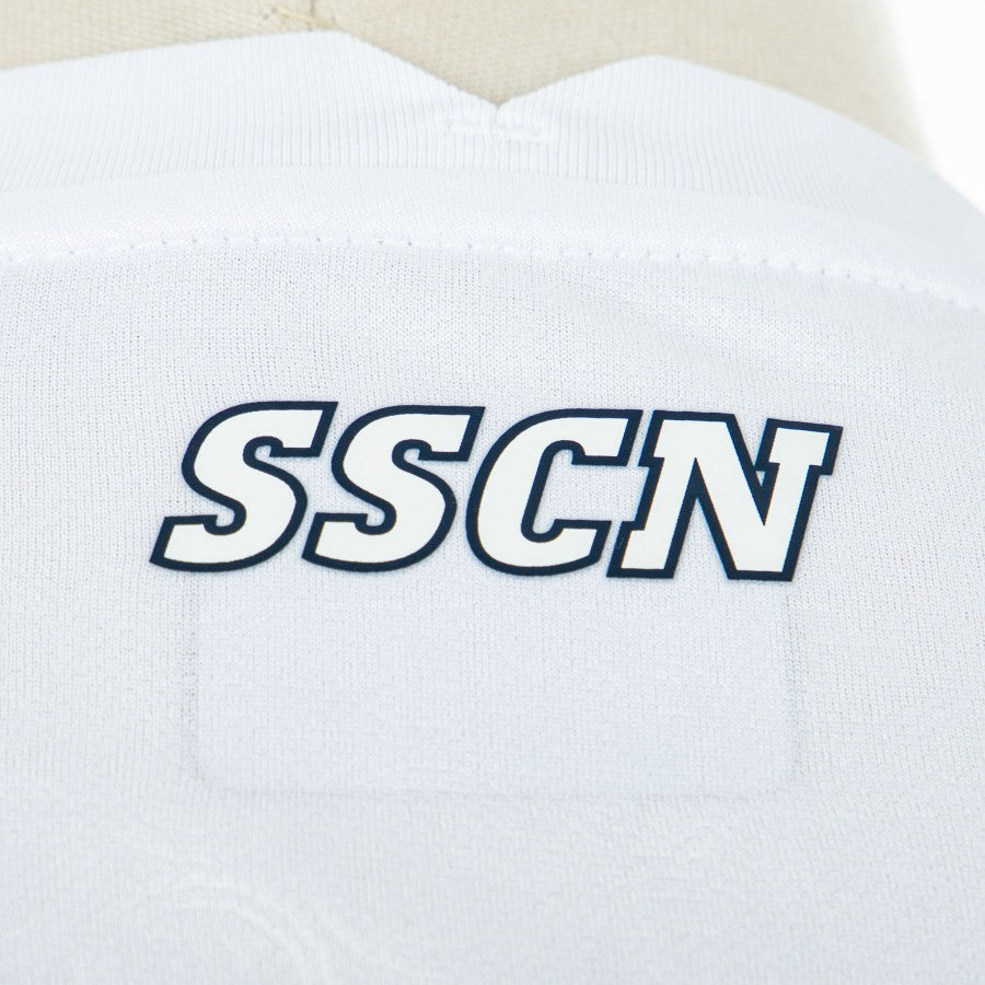 Lo stemma del Napoli è siliconato lato cuore, mentre gli sponsor commerciali Lete, MSC e Amazon sono termoapplicati. Il logo di EA7 è applicato in termotrasferibile traspirante sul lato sinistro. Infine, la personalizzazione col numero 77 Kvaratskhelia, in blu con i bordi azzurri, è applicata sul retro.