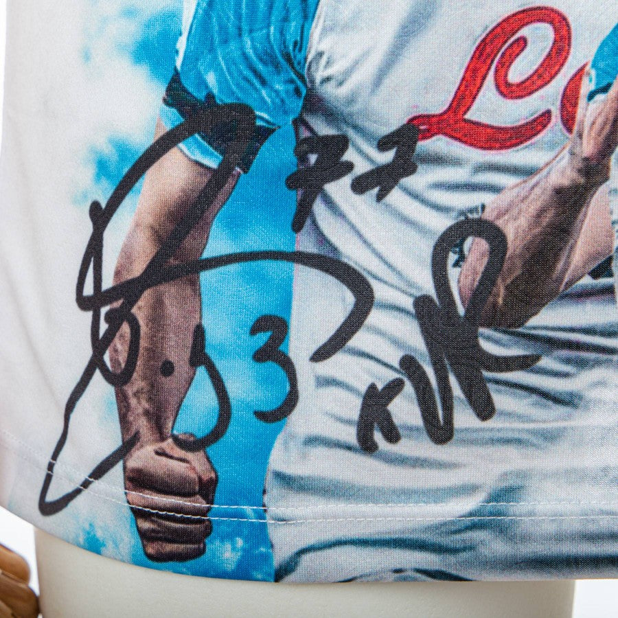 Presenta un design prevalentemente bianco con dettagli azzurri che richiamano i colori tradizionali del Napoli. La figura del giocatore nei suoi momenti salienti è sublimata sulla maglia in basso, con il suo autografo stampato sopra.