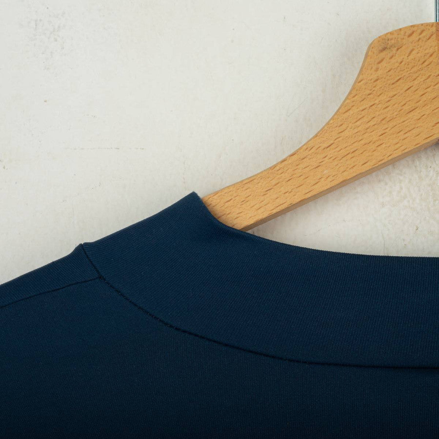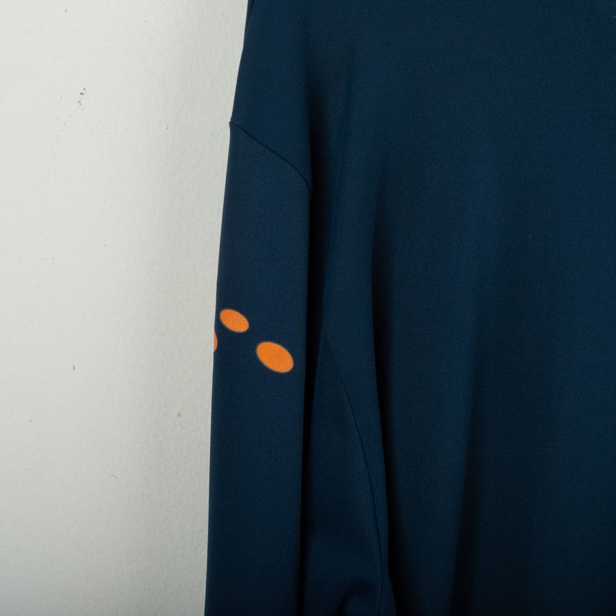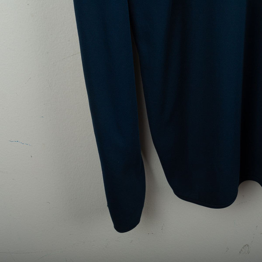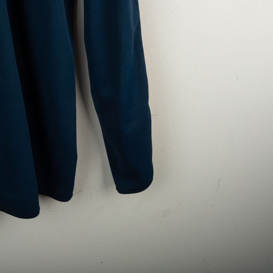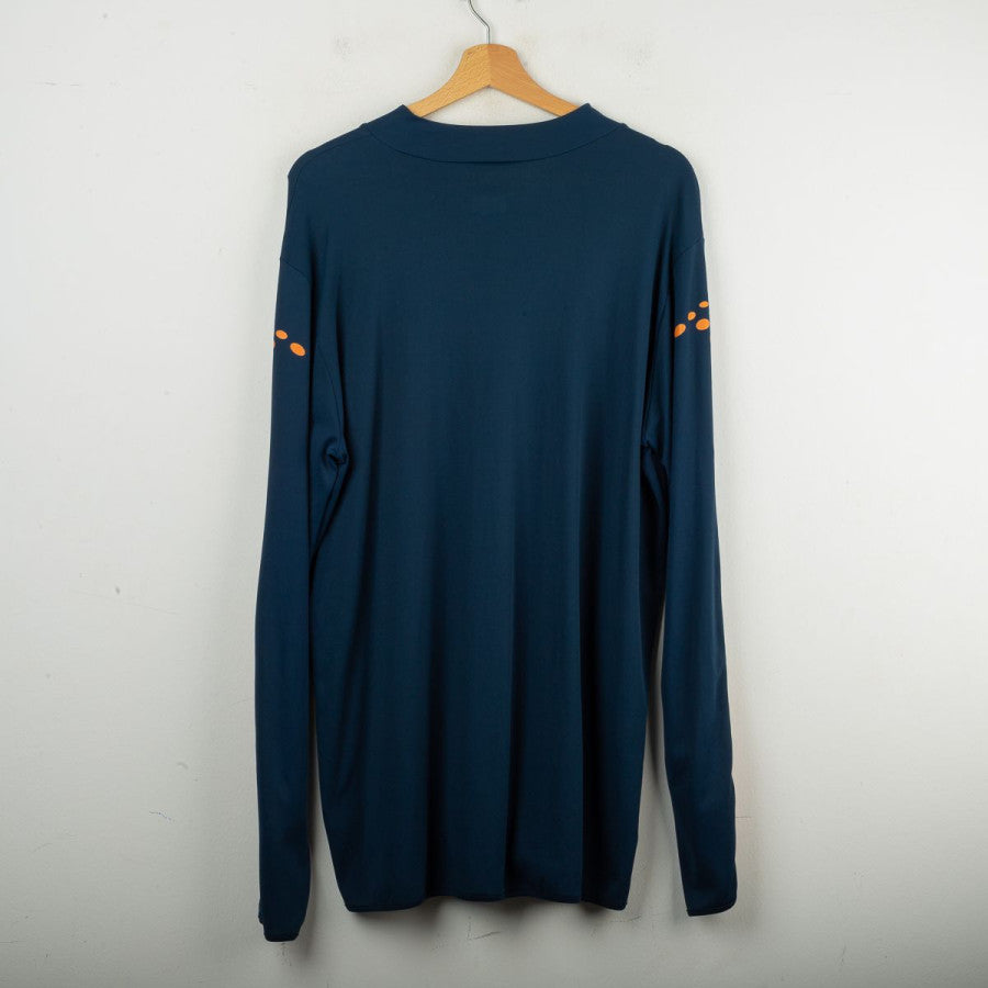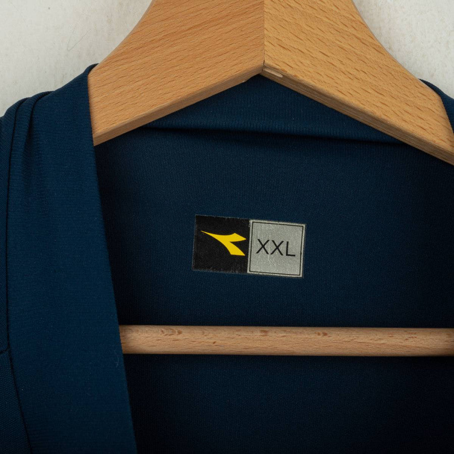 Maglia fourth dell'AS Roma utilizzata nella stagione 2003/2004, prodotta da Diadora. Versione a manica lunga, colore blu navy con dettagli giallorossi sul colletto e sulle maniche. Logo Diadora ricamato al centro, stemma AS Roma cucito lato cuore. Sponsor Mazda stampato in bianco sul fronte. Sul retro è presente la classica personalizzazione Diadora. Modello realizzato in tessuto tecnico leggero e traspirante, con inserti elasticizzati per un maggiore comfort. Taglia XXL.