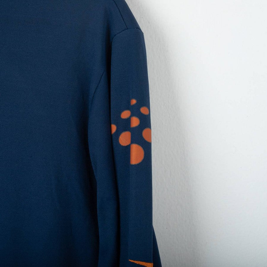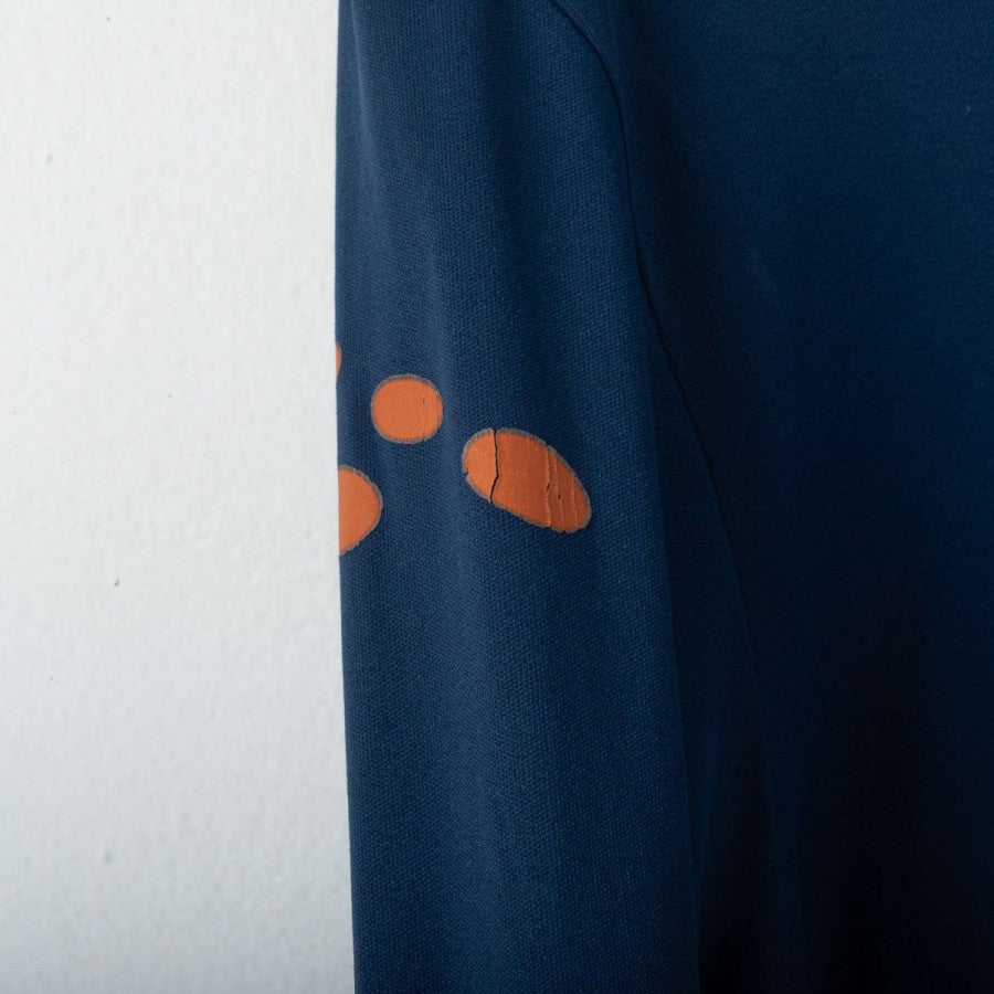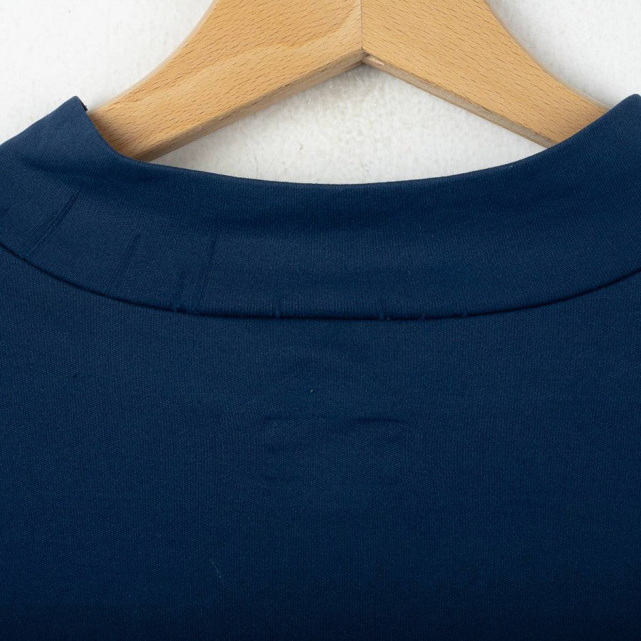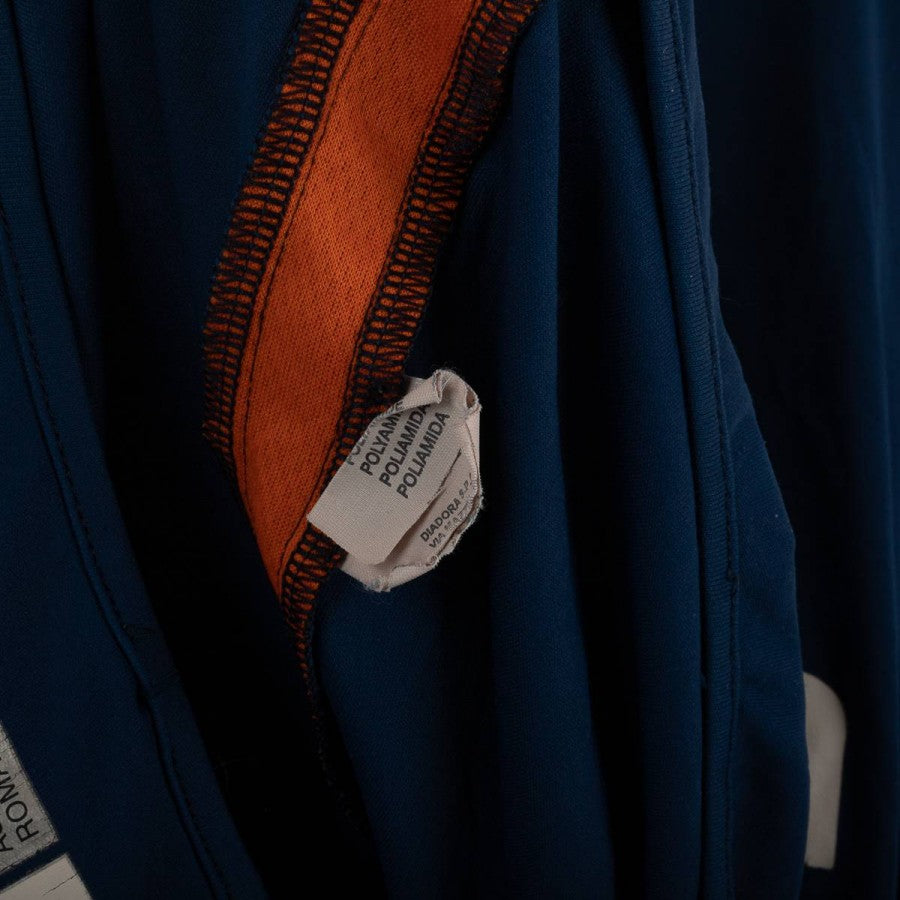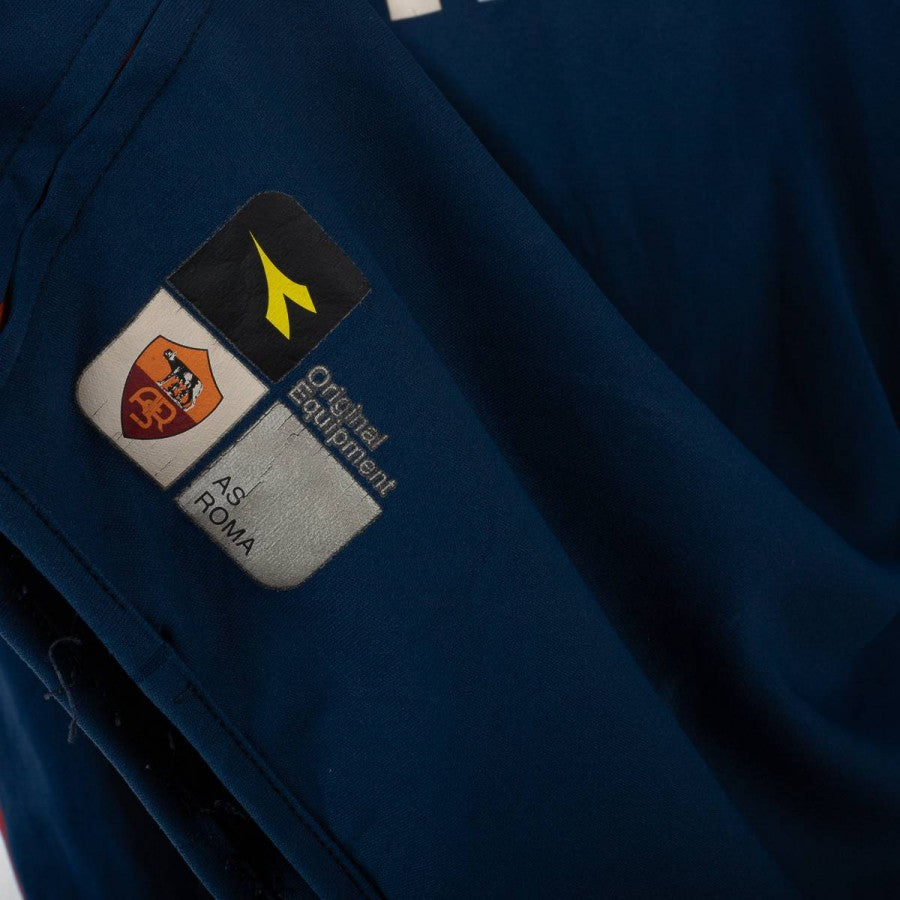Maglia a maniche lunghe della Roma, stagione 2003/2004, versione fourth, realizzata da Diadora. Il colore blu navy rende questa maglia una delle più iconiche alternative della storia giallorossa. Lo stemma AS Roma campeggia al centro, affiancato dal logo Diadora e dallo sponsor commerciale Mazda in colorazione argento. Presenti anche i loghi Diadora sulle maniche. Taglia L.