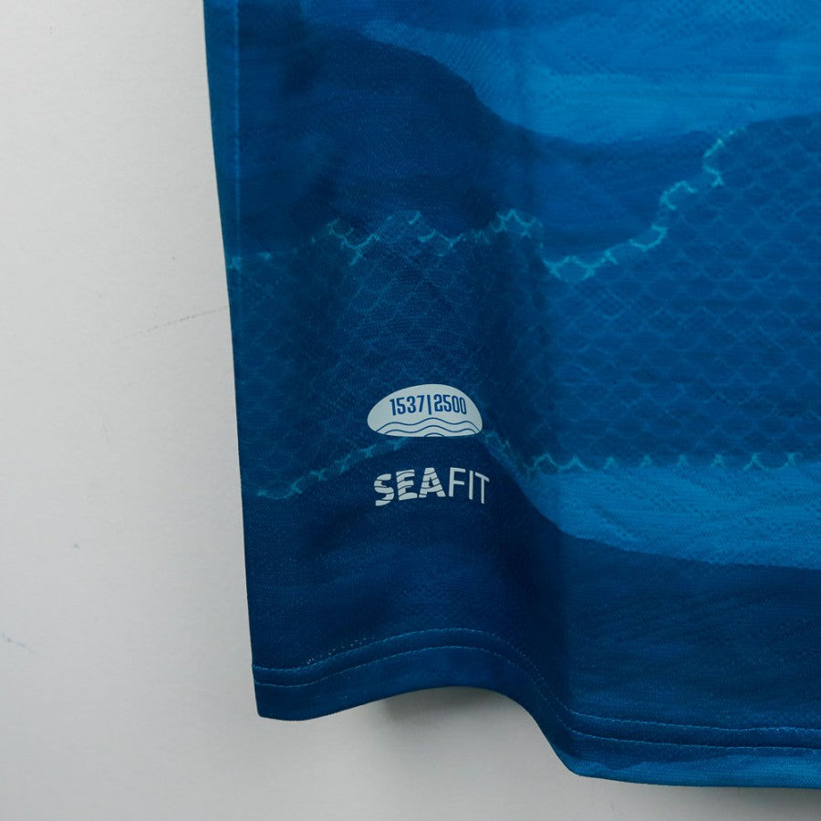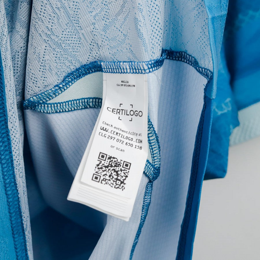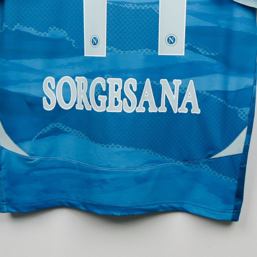 Maglia Fourth SSC Napoli della stagione 2024/2025, prodotta da EA7 e dedicata a Romelu Lukaku con il numero 11. Presenti il logo tecnico EA7 sul petto e il main sponsor MSC al centro, insieme allo sponsor secondario Sorgesana sul retro. La maglia è caratterizzata dal motivo “Partenope” con texture ispirate al mare e ai colori della tradizione napoletana. Sulla manica destra è presente il patch ufficiale della Serie A. Taglia L visibile sull'etichetta interna.