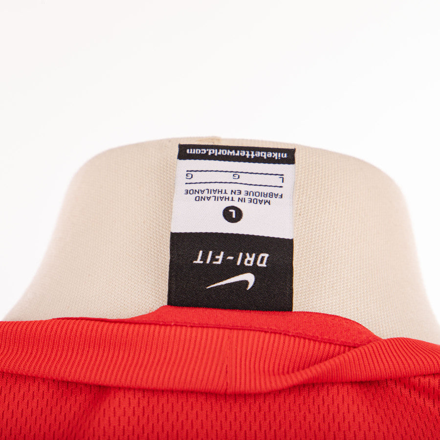 Il prodotto è presentato benissimo dalle foto a esso inerenti. La maglia è a maniche corte e il suo colore principale è il rosso, che però, almeno per quanto riguarda il davanti, verso l'estremità di questa va a sfumare verso una tonalità bianca; in alto a sinistra c'è il logo del club, ricamato, mentre dalla parte opposta, a destra, si trova, cucito e in colore bianco, il logo della Nike, sponsor tecnico; sul centro della maglia, invece, si estende la dicitura bianca, in termoapplicato, EVO, sponsor commerciale della squadra, preceduta dal logo dell'azienda, anch'esso termoapplicato e in bianco; sulla manica destra, inoltre, è presente, sempre in termoapplicato, la patch del torneo a cui partecipano i tedeschi.