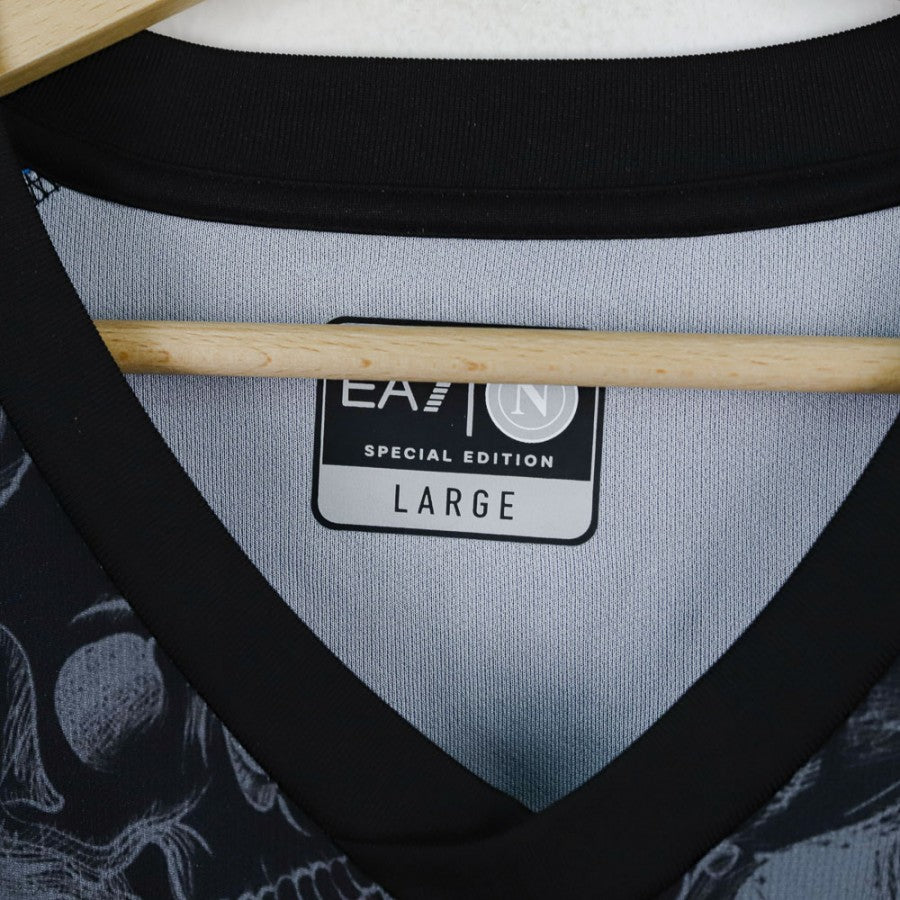 Maglia speciale Halloween del Napoli, stagione 2023/2024, prodotta dallo sponsor tecnico EA7 Emporio Armani. La maglia è caratterizzata da una grafica spettrale con teschi su sfondo nero, con dettagli in blu chiaro. Sul fronte troviamo lo stemma del Napoli e lo Scudetto della Serie A, insieme agli sponsor MSC e EA7. Sul retro è personalizzata con il nome "Di Lorenzo" e il numero 22, in blu chiaro, firmato a mano dal giocatore. È presente anche lo sponsor Upbit. Un pezzo esclusivo per i tifosi, che celebra una delle ricorrenze più originali nel calendario sportivo partenopeo.
