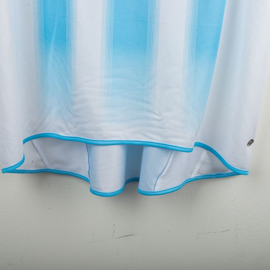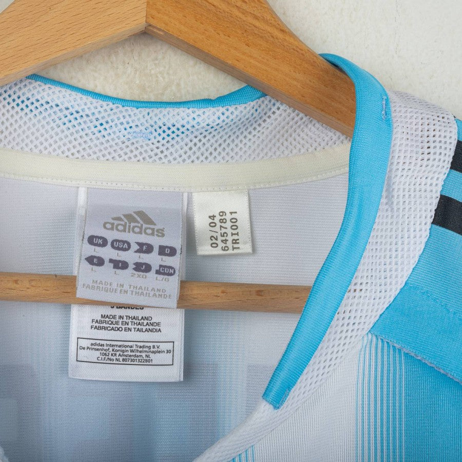 Maglia ufficiale home dell'Argentina prodotta da Adidas per la stagione 2004, con personalizzazione Lionel Messi numero 18. Classico design albiceleste a strisce verticali bianche e celesti con dettagli neri. Stemma AFA ricamato sul petto lato cuore e logo Adidas ricamato sul lato destro. Numero 18 applicato in nero con dettagli traforati sul fronte e sul retro, accompagnato dalla scritta “Messi” sul retro. Bandiera argentina ricamata sulla manica. Tessuto tecnico leggero e traspirante, pensato per offrire massimo comfort in campo. Una delle prime maglie ufficiali di Messi agli inizi della sua carriera con la Selección. Taglia L.