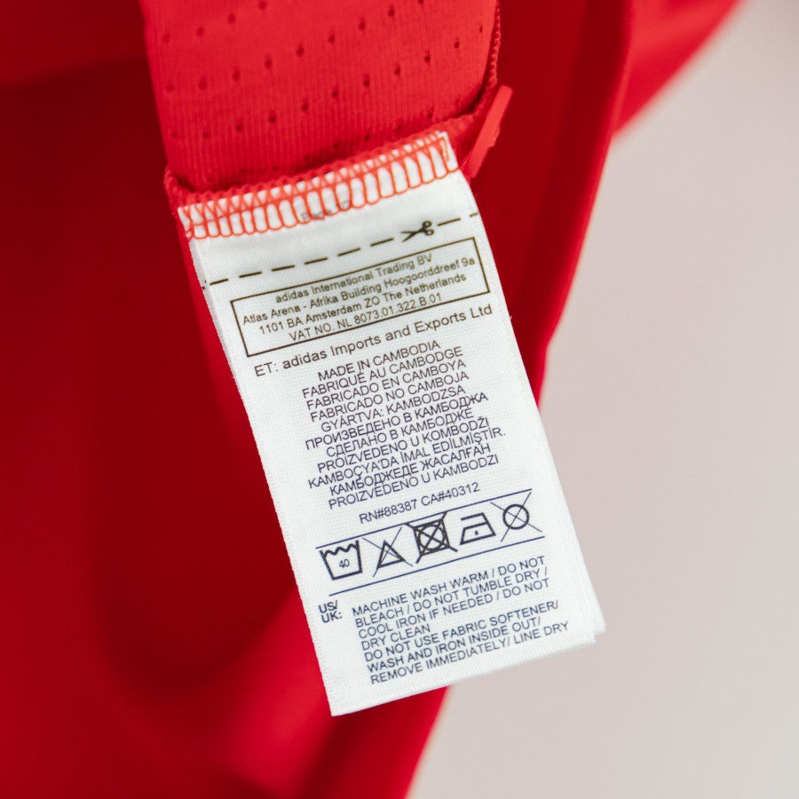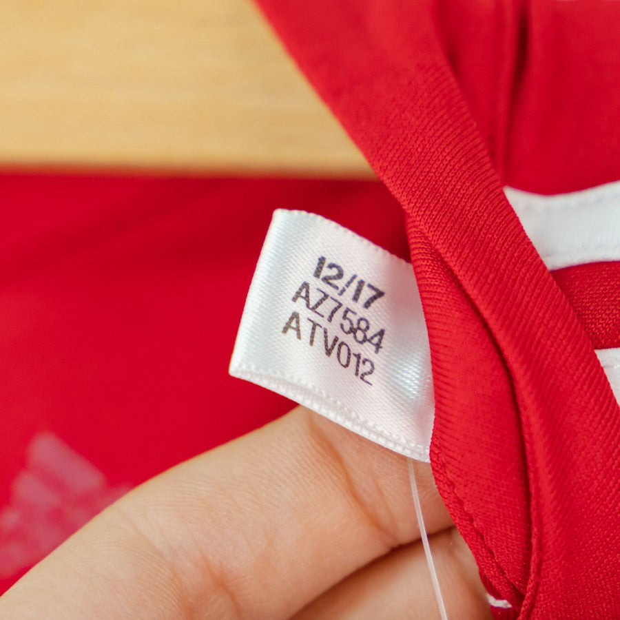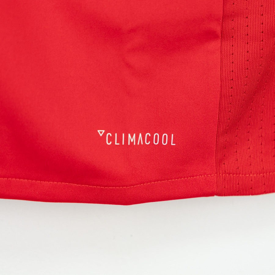 Modello con colletto a polo con due bottoncini, di colore rosso con inserti bianchi e neri. Lato cuore lo stemma della squadra, sulla destra il logo Adidas ricamato. Al di sotto lo sponsor commerciale Chevrolet.