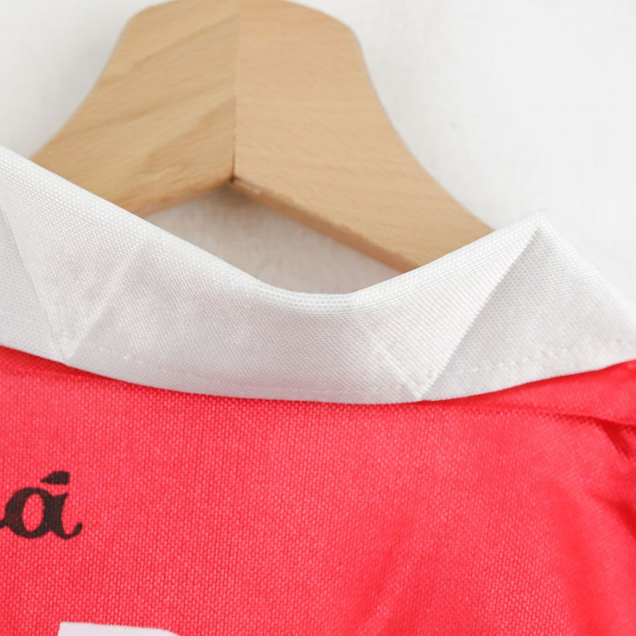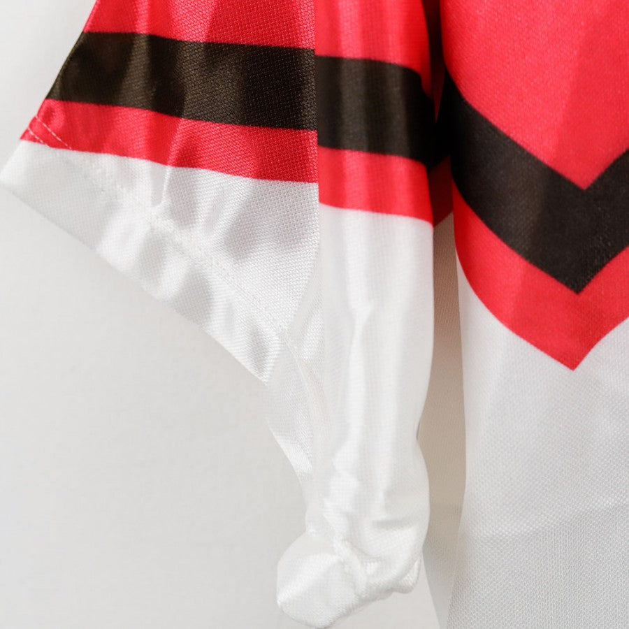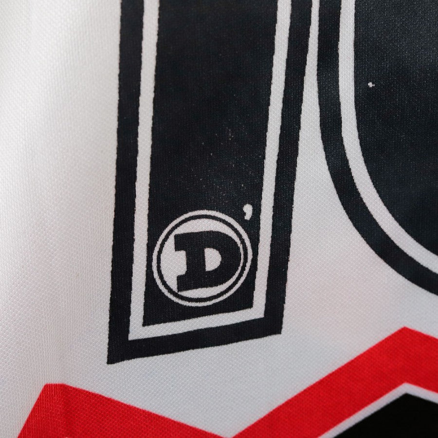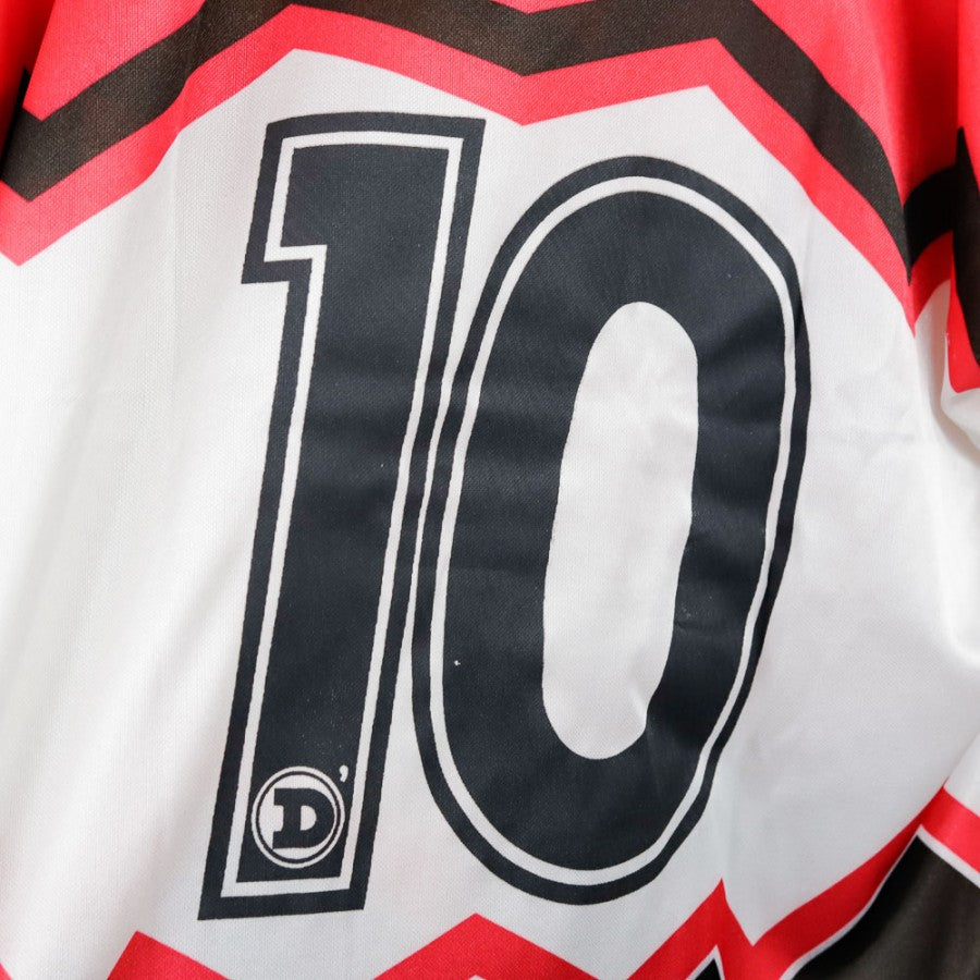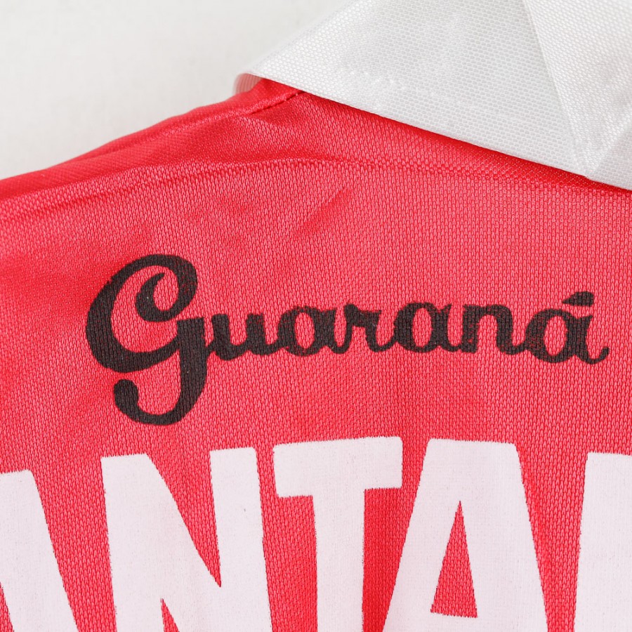 Maglia Home Botafogo S.P della stagione 1992/1993, realizzata da Del'Erba. Il design è uno dei più iconici del calcio brasiliano anni ‘90, con la sua base bianca e la caratteristica grafica a zig-zag in rosso e nero che attraversa l'intera casacca. Lo sponsor commerciale Guaraná Antarctica è presente in grande evidenza sul petto e sul retro. Il numero 10 è applicato in grande formato sulla schiena.